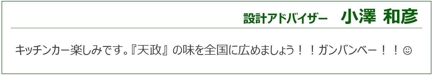 今回、より多くのお客さまに「天政の味」をお届けするため、キッチンカー導入を目指してクラウドファンディングに挑戦することにしました。どうか、みなさまのあたたかいご支援をよろしくお願いいたします。