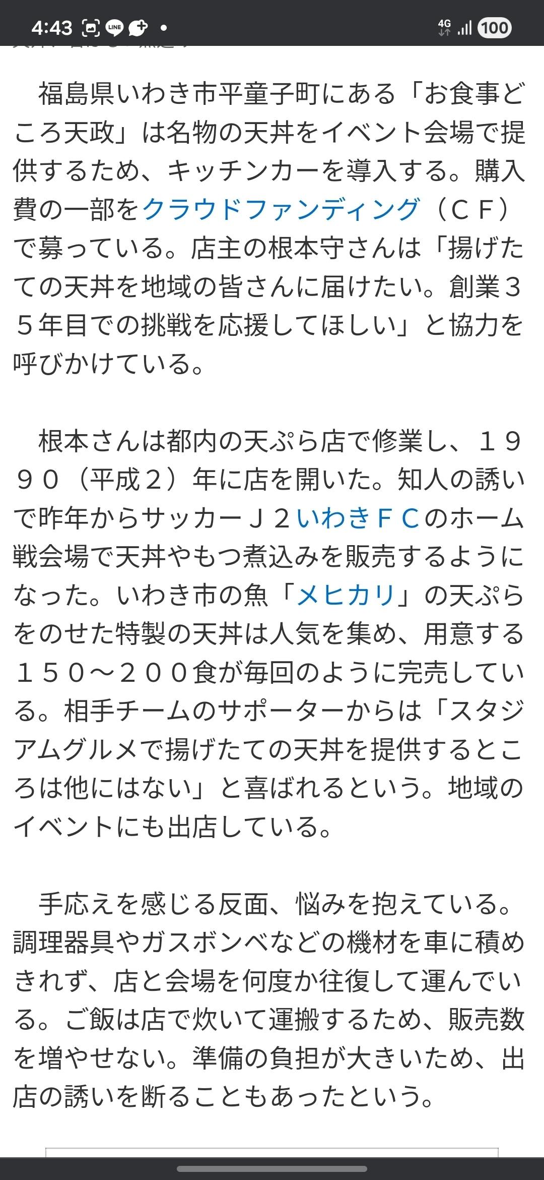 福島県いわき市でお食事どころ「天政」を営んでおります根本守と申します。より多くのお客さまに「天政の味」をお届けするため、キッチンカー導入を目指してクラウドファンディングに挑戦することにしました。どうか、みなさまのあたたかいご支援をよろしくお願いいたします。
