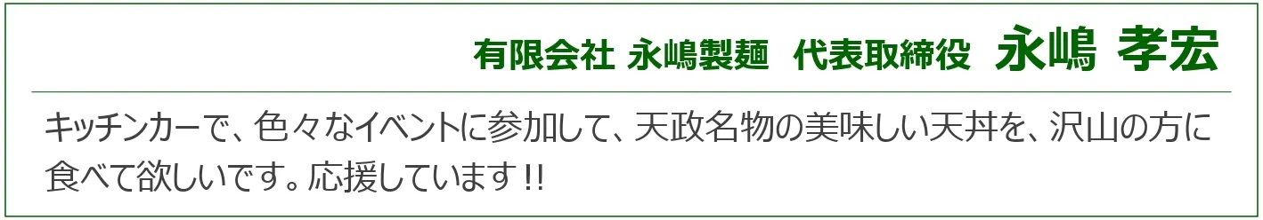今回、より多くのお客さまに「天政の味」をお届けするため、キッチンカー導入を目指してクラウドファンディングに挑戦することにしました。どうか、みなさまのあたたかいご支援をよろしくお願いいたします。