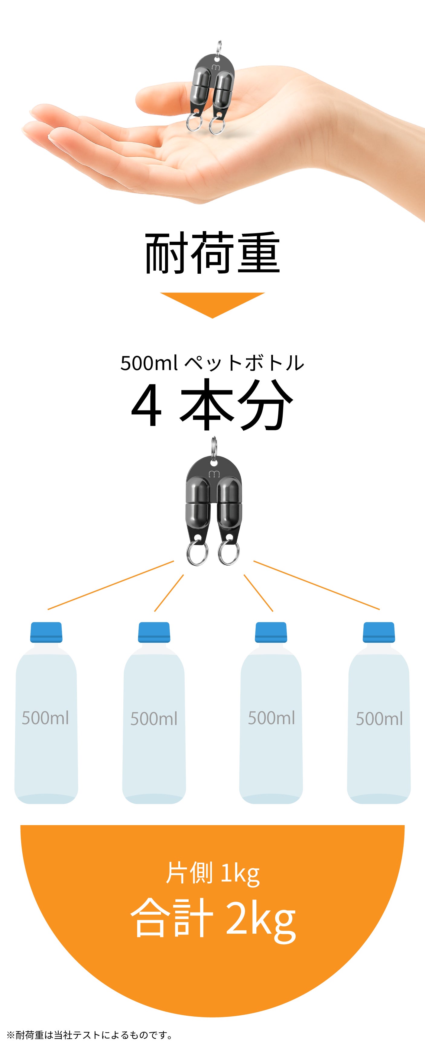 マグロックは強力なネオジム磁石を使用しており、静止状態では片側約1kg、両側合わせると最大約2kgの耐荷重性能があります。