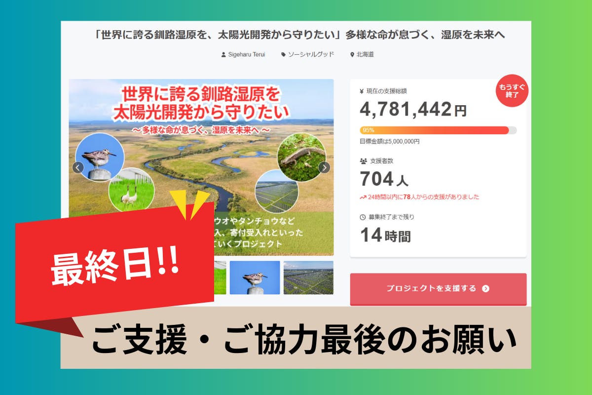 2025/12/26 10:31本プロジェクトをご覧いただき、ありがとうございます。また、ご支援・ご協力を頂いている皆様には改めて感謝を申し上げます。本日、最終日となりました!!!午前10時時点で700人以上の支援者の皆様から、目標金額の96%まで達成することができています。本当にありがとうございます...!2025年も余すところあとわずかとなりましたが、今年は釧路湿原周辺のメガソーラー問題に大きく揺れた1年でした。連日のようにメディアで取り上げられたこの問題は、社会全体に大きな波紋を広げる事案となりました。昨日の報道でも浮き彫りになった通り、地域住民の声を顧みない不適切な開発が強行されているにも関わらず、現行法ではそれを止める手立てが極めて限定的であるという厳しい現実があります。国による一刻も早い法整備が待たれる一方、本プロジェクトは、希少種が生息する土地を自ら調査・取得することで、貴重な自然環境を直接的に守り抜くための取り組みです。記者会見で示されたのは、これまでに例を見ない地域住民の固い結束です。釧路自然保護協会の神田会長も指摘していますが、私たちはすべての再生可能エネルギー開発を否定しているわけではありません。私たちが求めているのは、あくまで「自然環境と地域住民との共生」です。地域の宝である自然に一人ひとりが高い関心を持ち、異変にいち早く気づけるような連携体制を築くこと。その重要性を改めて痛感しています。この課題は、決して釧路だけの問題ではなく、日本各地の自治体が直面している共通の喫緊の課題です。政府が決定した規制強化策を「実効性ある法の網」として機能させるためには、現場を知る私たちの声が欠かせません。全国のどの地域においても、自然環境と再生可能エネルギーの「真の共生」が実現されるよう、皆様とともに知恵を絞り、一歩ずつ取り組んでまいりたいと思います。本日が最終日となります、最後までどうぞよろしくお願いいたします!!! もっと見る