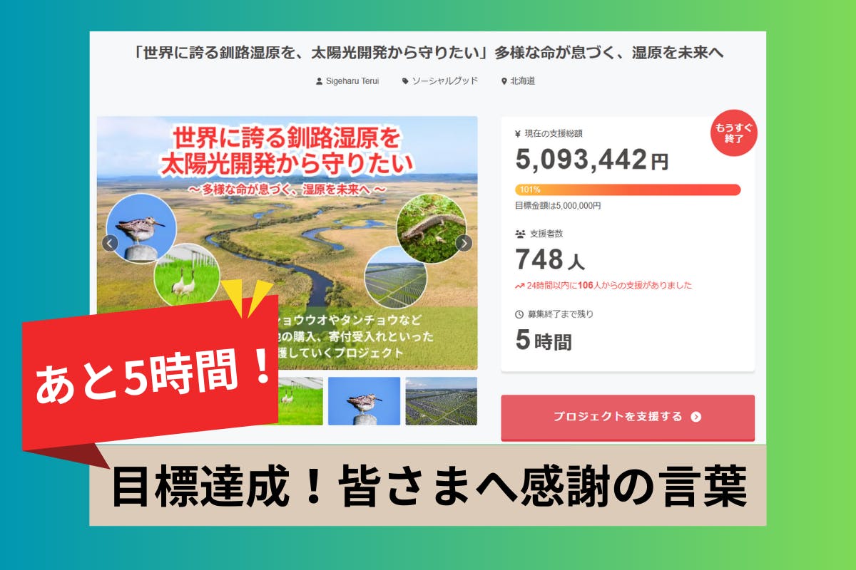 2025/12/26 19:00【祝・目標達成!】皆様の多大なるご支援のおかげで、終了を待たずして目標金額を達成することができました! 本当に、本当にありがとうございます。当初は「最後の一押し」をお願いするメッセージを準備していたのですが、皆様の圧倒的なスピードと熱意に事務局一同、驚きと感謝で胸がいっぱいです。■ 700人を超える「仲間の輪」が日本を動かす今回のプロジェクトには700名を超える方々にご参加いただきました。これは単なる資金集めではなく、「釧路湿原、そして日本の自然環境を不適切な開発から守りたい」という全国の皆様の意志の現れです。連日の報道にある通り、この問題はもはや釧路だけのものではなく、日本全体の課題として認識され始めています。皆様の声が、まさに「社会を動かす力」となったのだと思います。■ 2026年、実効性のある「保全」のステージへ政府もようやくメガソーラー規制強化へと舵を切りましたが、現場での守りはこれからが本番です。皆様から託された支援金をもとに、2026年から本格的な活動を開始します。 すでに「希少種を守るために土地を寄付したい」というお申し出も届き始めており、保全の輪は確実に広がっています。■ 最後に:残り時間も大切に歩みますクラウドファンディングの期間はあとわずか残されています。最後まで一人でも多くの方にこの現状を知っていただけるよう、走り抜けます。活動の成果や土地取得の進捗については、今後も責任を持って皆様にご報告させていただきます。私たちの挑戦は、ここからがスタートです。これからも、釧路湿原の未来を共に見守っていただければ幸いです。最後までどうぞよろしくお願いいたします! もっと見る