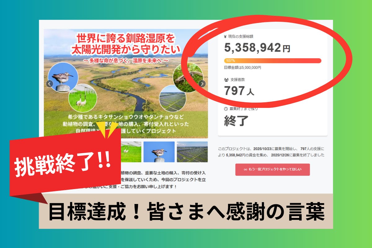 2025/12/27 15:00【プロジェクト終了のご挨拶】▼釧路湿原の未来を、皆様と共に守り抜くために2025年も余すところあとわずかとなりました。今年は釧路湿原周辺のメガソーラー問題を契機に、自然環境のあり方が社会的に大きく問われた激動の1年でした。その締めくくりとして挑戦した本プロジェクトですが、おかげさまで終了を待たずして目標金額を達成し、無事に終了することができました。本当にありがとうございます。800人近い支援者の皆様、そしてこの問題を自分事として捉え、共に声を上げてくださったすべての方々に、三団体を代表して心より深く感謝申し上げます。▼私たちが直面している現実と、守るべき「真の価値」プロジェクトを通じて私たちが訴えてきたのは、現在の法制度だけでは守りきれない「国立公園外の湿原」の危機です。これまで、地域住民や専門家がどれほど懸念を表明しても、現行法の限界によって不適切な開発を止められないという厳しい現実に幾度となく直面してきました。また、過去の保全活動の歴史からは個体の移転だけでは生態系を守ることはできず、生息地そのものを維持することの重要性を痛感してきました。これらの経験は、私たちが掲げる「生息地(環境)を自ら取得して守る」というナショナルトラスト活動こそが、確実かつ永続的な解決策であるという確信を、より強固なものにしました。▼全国へ広がる共生への願い皆様から寄せられた熱いメッセージは、この問題がもはや釧路一地域の課題ではなく、日本全体の再生可能エネルギーと自然環境のあり方を問う象徴的な事案であることを証明してくれました。こうした草の根の声は、国を動かし、不適切な開発を抑止するための法改正や規制強化に向けた大きな転換点を生み出しつつあります。私たちが求めているのは「対立」ではなく、自然環境と地域住民が真に調和し、「共生できる未来」です。▼2026年、実効性のある保全のステージへ皆様から託された貴重な支援金をもとに、2026年度より本格的な希少野生生物の調査と土地取得活動を開始いたします。 すでに「環境保全のために土地を寄付したい」という申し出も届き始めており、民間の保護地を広げる活動は着実に前進しています。土地の取得から適切な管理、そして次世代への普及啓発まで。私たちの挑戦は、ここからが本当のスタートです。活動の成果については、今後も責任を持って皆様に随時ご報告させていただきます。未来の子どもたちに、この美しい釧路湿原を「不毛の大地」ではなく「命の源」として引き継いでいくために。これからも共に歩んでいただければ幸いです。本当にありがとうございました! もっと見る