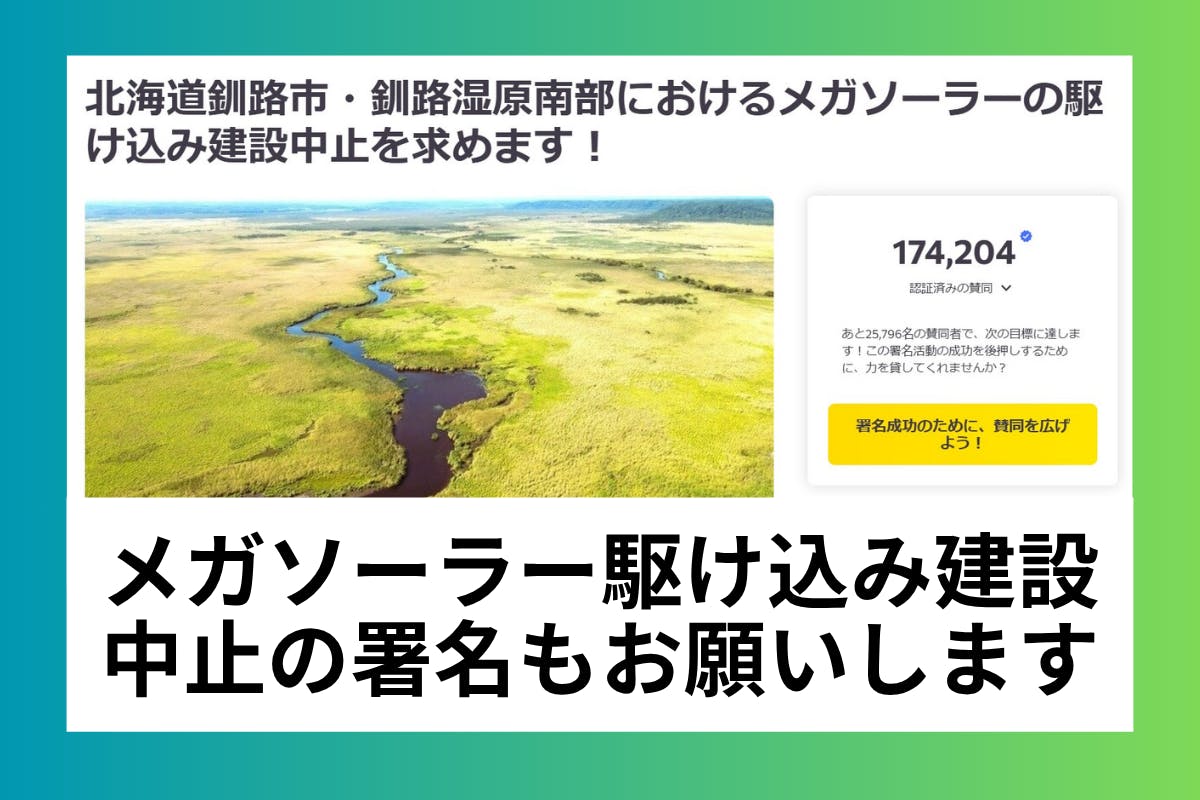 実は今回のプロジェクトとは別に、2025年3月末に開始した「北海道釧路市・釧路湿原南部におけるメガソーラーの駆け込み建設中止を求めます!」といったオンライン署名がございます。