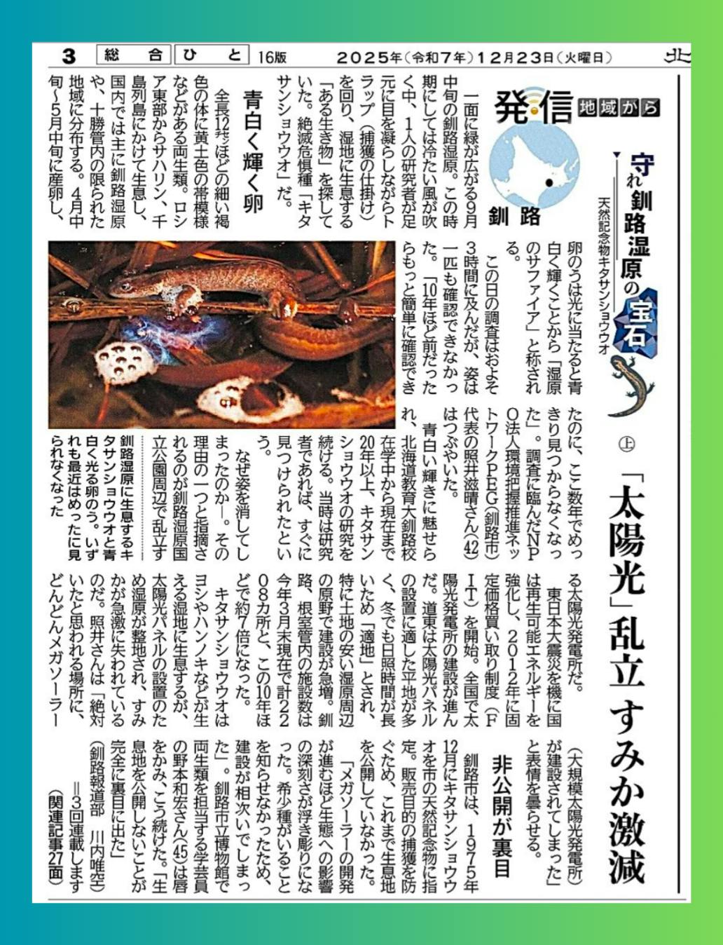 また、今日の北海道新聞で希少種であるキタサンショウウオについての連載がはじまりました。