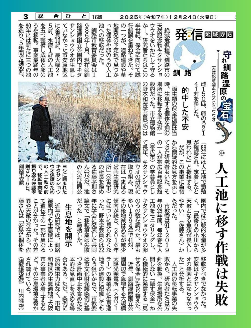 絶滅危惧種キタサンショウウオを守るため1986年に始まった人工池への移転事業が、天敵の侵入等により上手くいかなかった実態を報じる記事です。