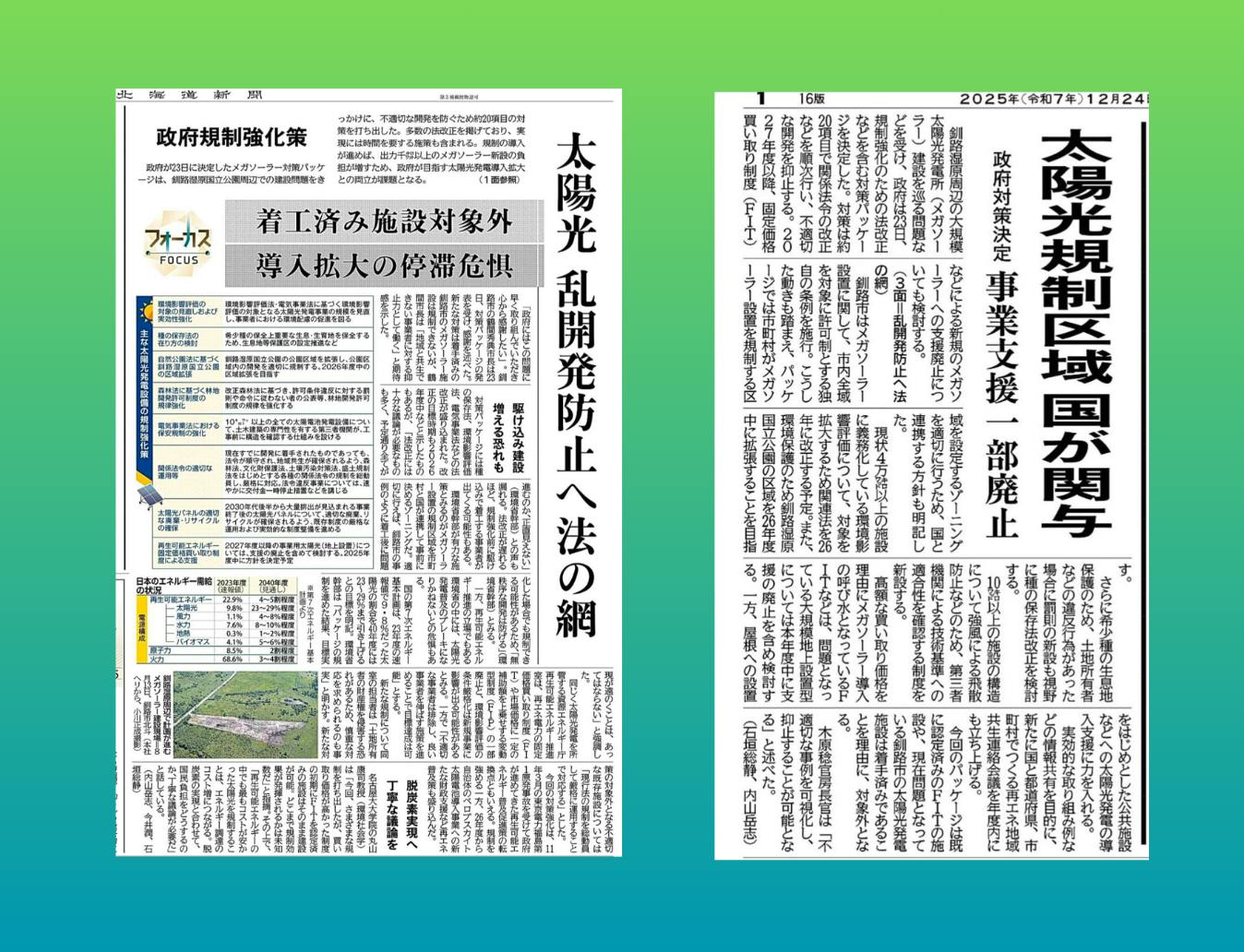 政府は23日、釧路湿原周辺での問題を受け、規制強化策を決定。環境アセス対象の拡大や規制区域内でのFIT/FIP支援廃止など約20項目を盛り込み、26年度には国立公園の区域拡張を目指す。