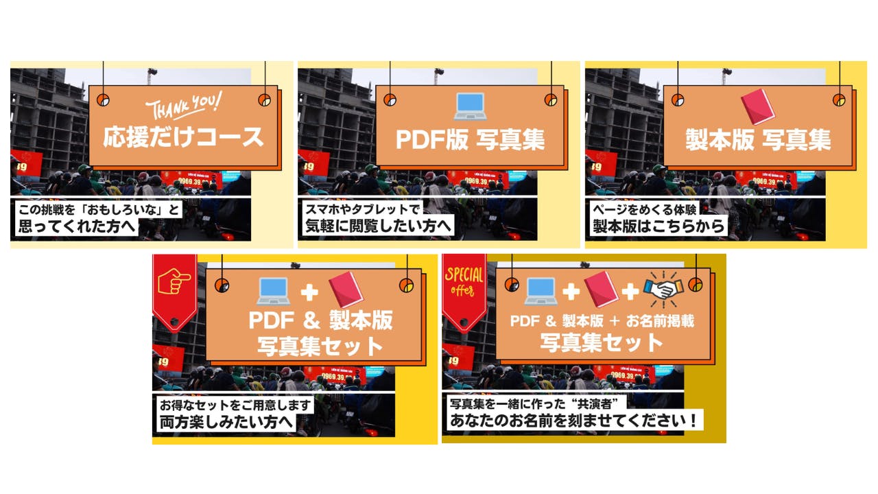 今回のプロジェクトが達成された暁には、写真集を作成し、ベトナム現地の光景をお届けするとともに、皆様の支援額の一部を寄付*いたします。