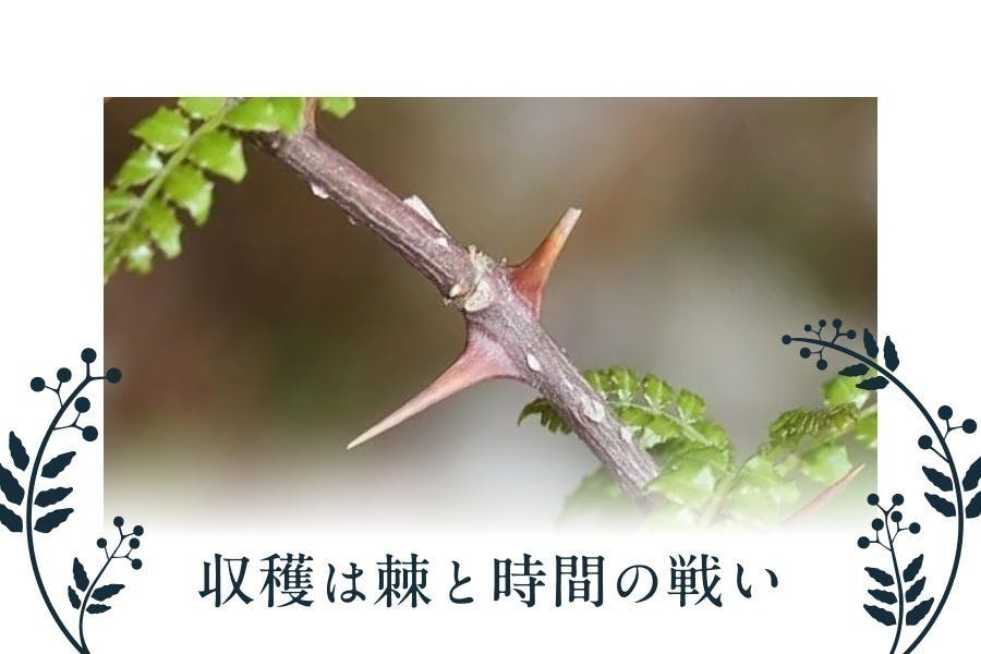 また、枝には棘があり収穫を行う際にも気をつけて刈り取っていく必要があるため大人が1時間で収穫できるのは2〜4kg程度と言われています。