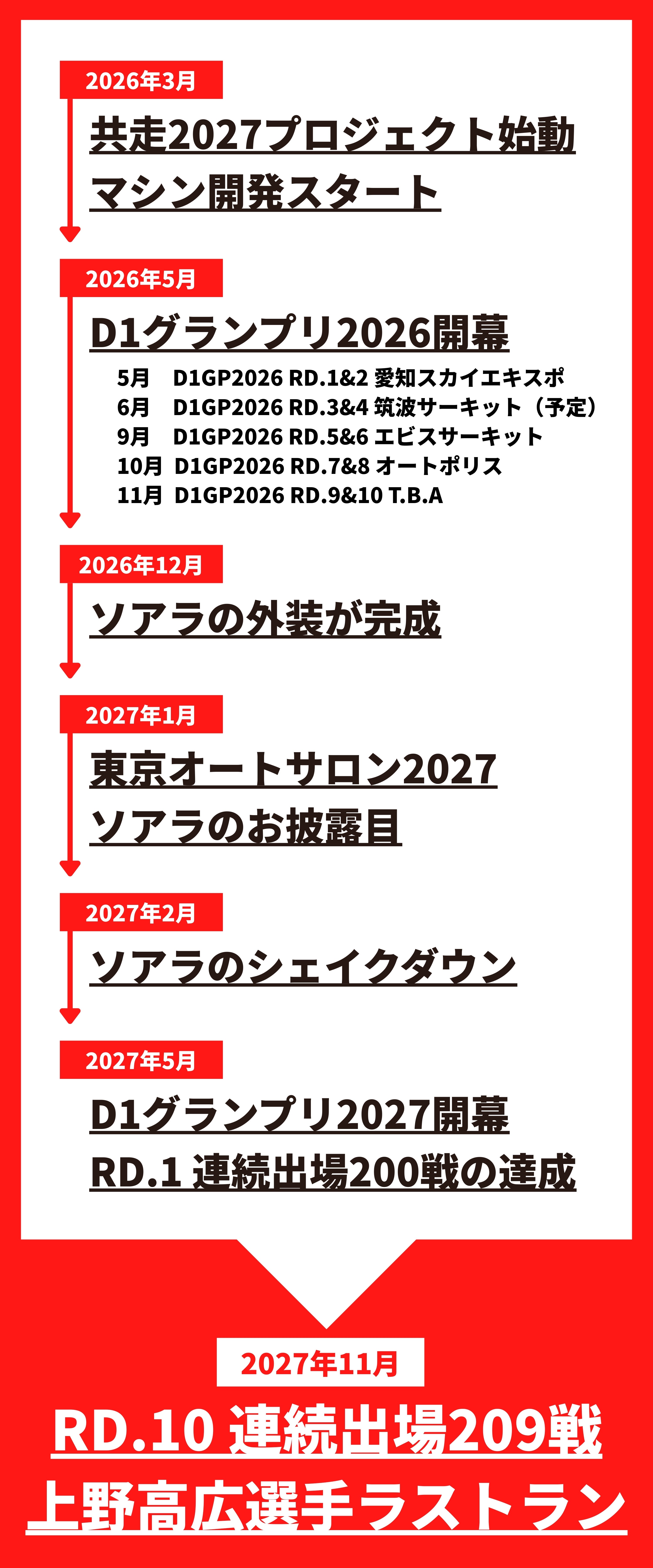 共走2027は、上野高広選手が前人未踏のD1グランプリ連続参戦200戦という歴史的な節目に挑み、愛するソアラとともに最高のラストランを迎えるまでを、みなさまと一緒に走り切る2027年までのプロジェクトです。
