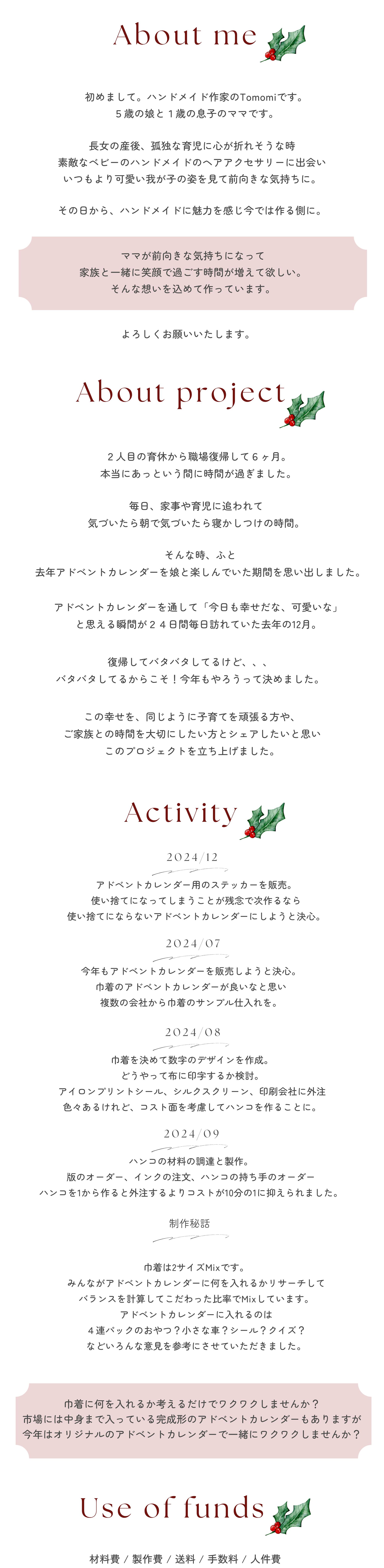 応援の気持ち ここまで読んでいただきありがとうございます。 いただいたお金は今回の製作費(初期費用)に充てさえていただきます。 12月にお礼のメッセージをお送りします。 また、クリスマスまでクラファンページを更新しようと思うので 一緒に楽しい期間を過ごせると嬉しいです。