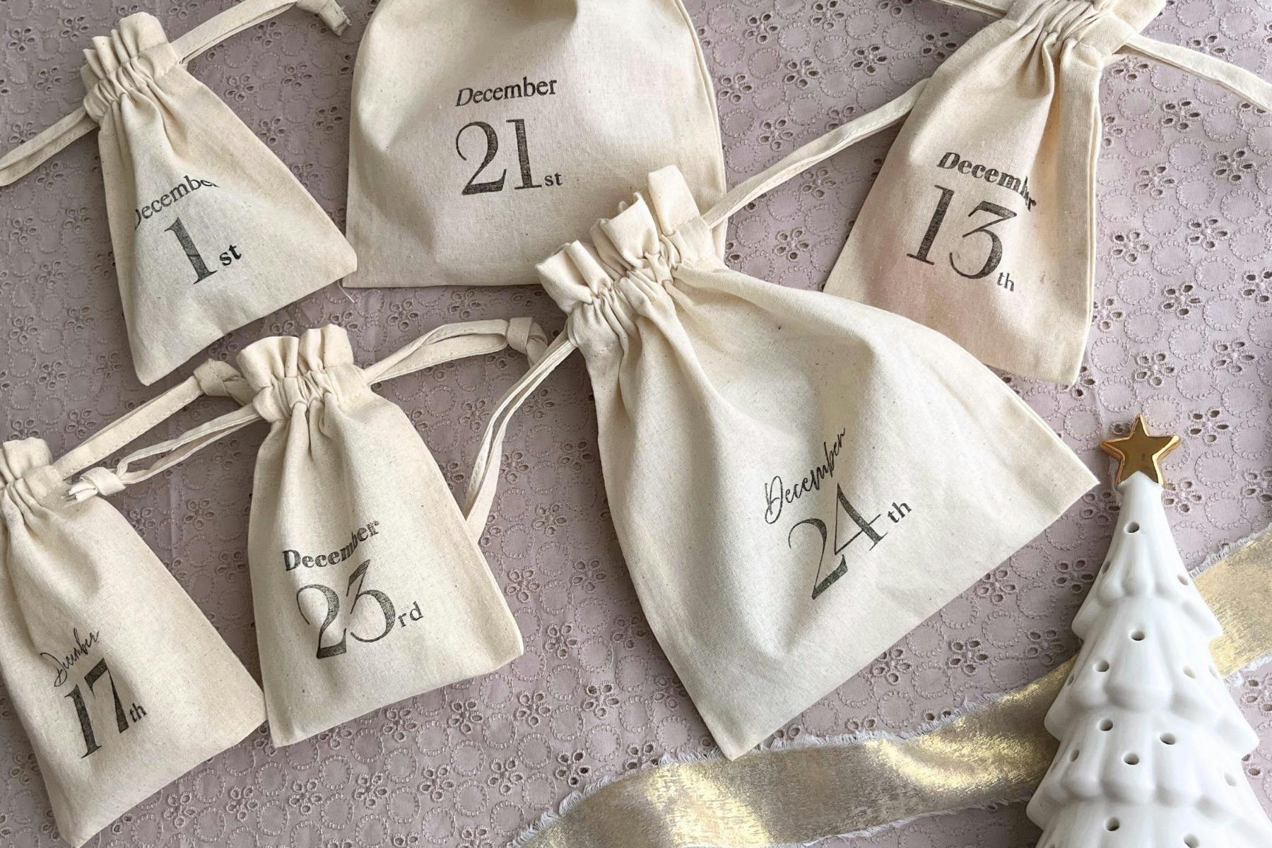 巾着のアドベントカレンダー サイズ違いの巾着をmixした24袋をお贈りします。 サイズの詳細は画像にてご確認いただけます。