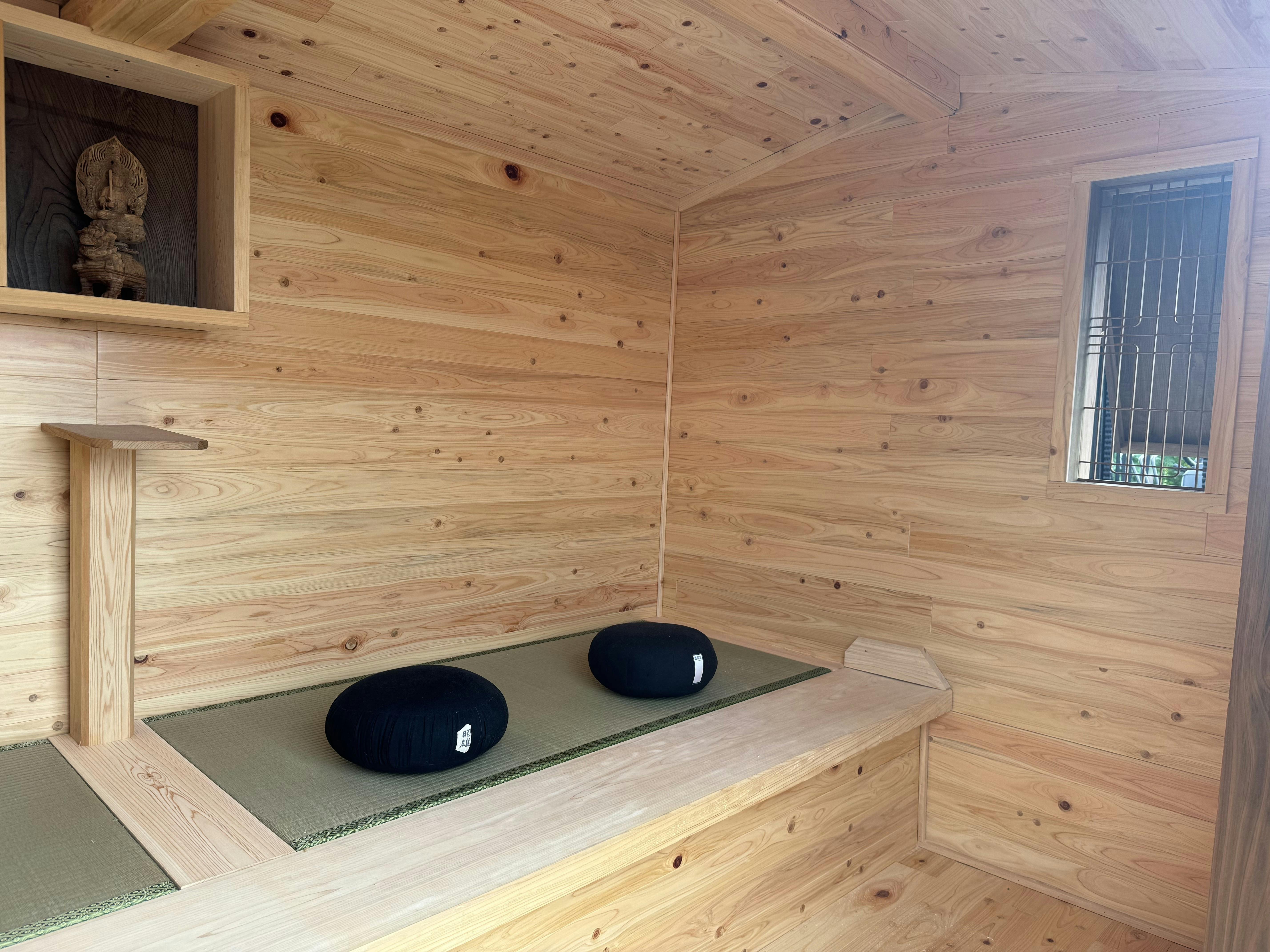 可搬式茶室・坐禅堂の製作においても、この技術と経験を活かし、伝統的な茶室の美しさと機能性を保ちながら、どこにでも運べる革新性を実現しました。木の温もりを感じられる空間で、本格的な茶室体験、坐禅体験ができることが私たちの誇りです。