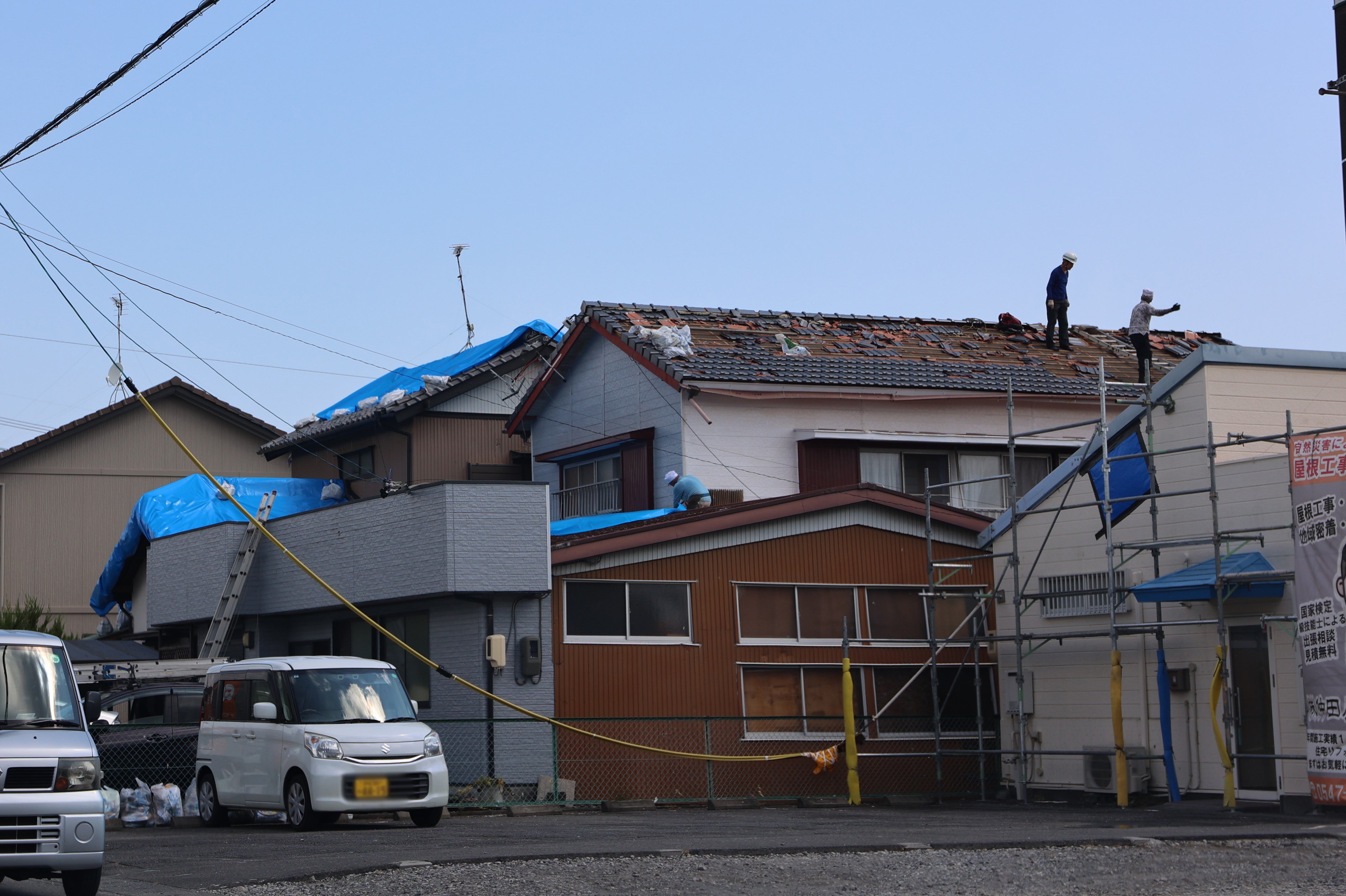 雨風をしのぐブルーシートを屋根に張る作業は、経験と知識が求められる。安全管理上、事故が起きないように応急修理制度など災害救助法による国の支援があることを周知する