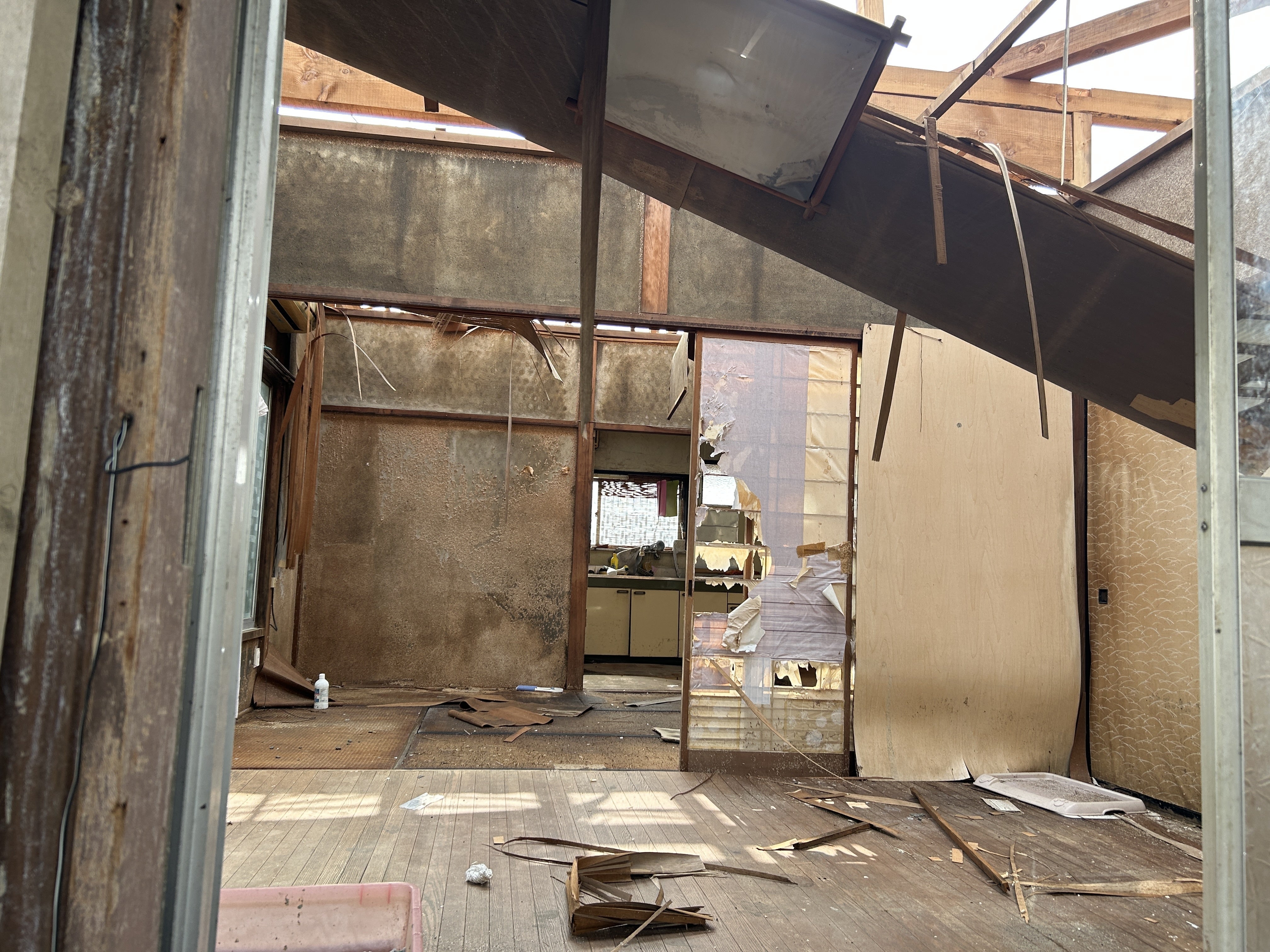 竜巻で屋根が損傷したケースが多いのですが、屋根の被害だけでは、罹災証明書に記載される被害の程度は「準半壊」以下。公的支援が限られるため自主再建を中心に生活を再建することを考えなければなりません。しかし、屋根が壊れた状態で日常生活を続けるのは困難ですし、雨が吹き込めば家全体が傷んでしまいます。