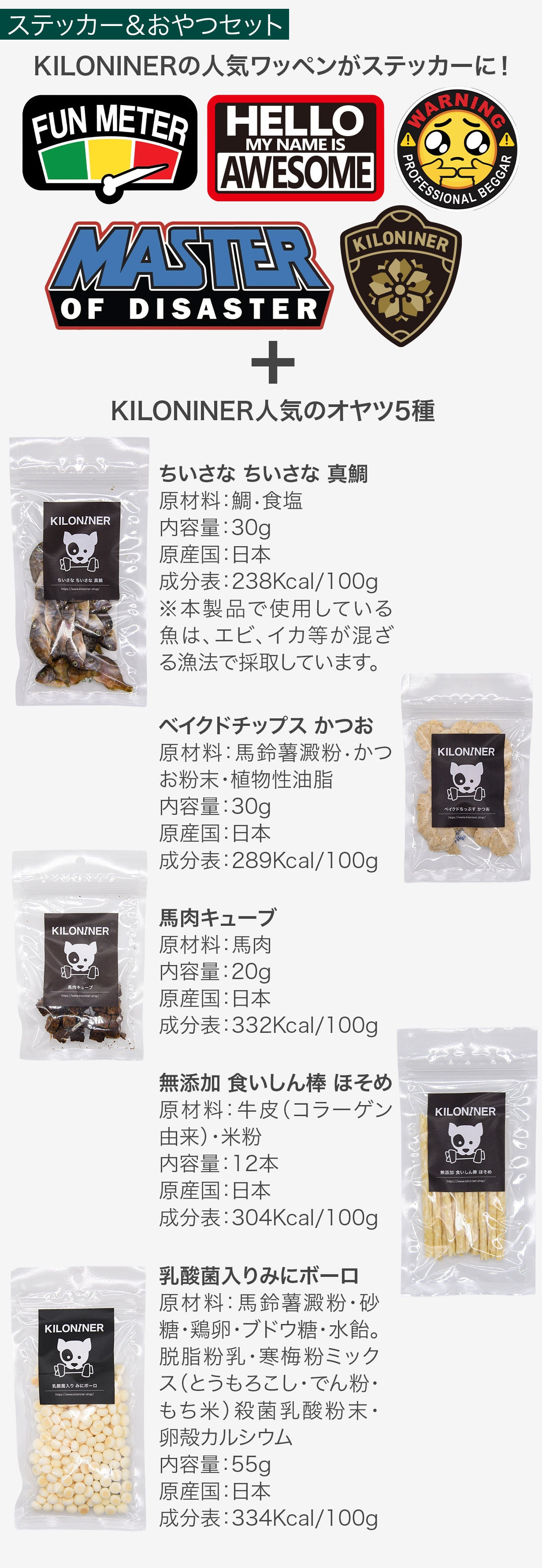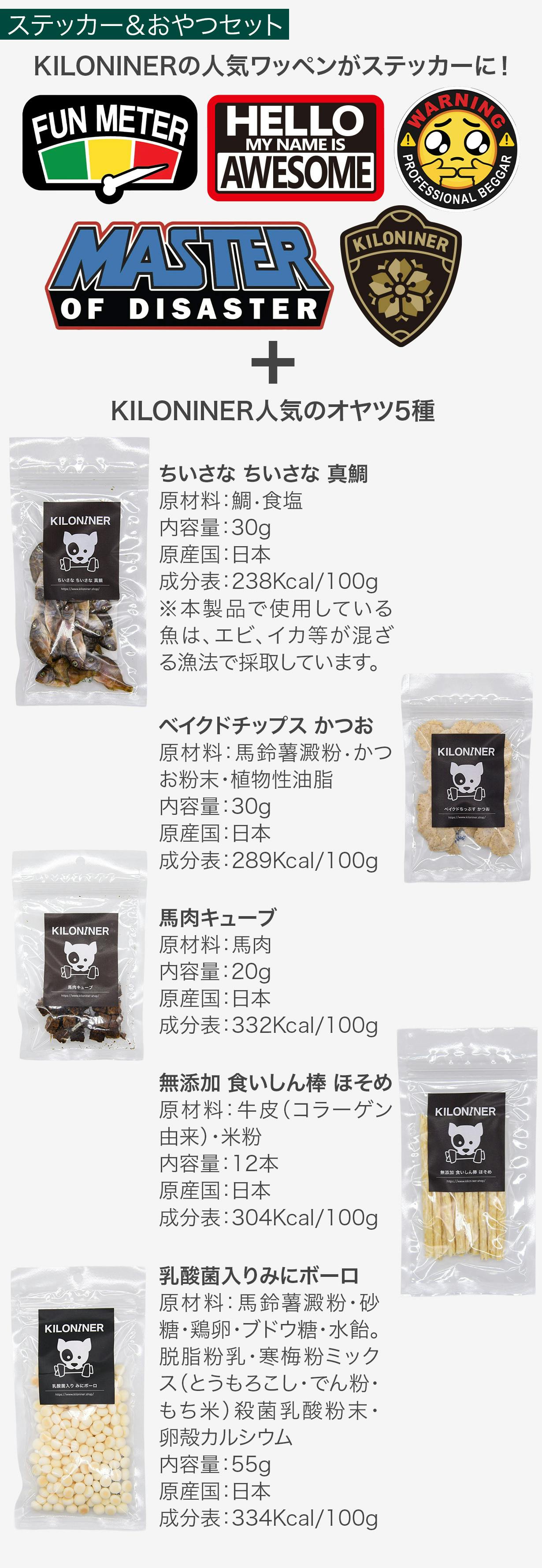 KILONINERステッカー5枚&人気のオヤツ5種セット