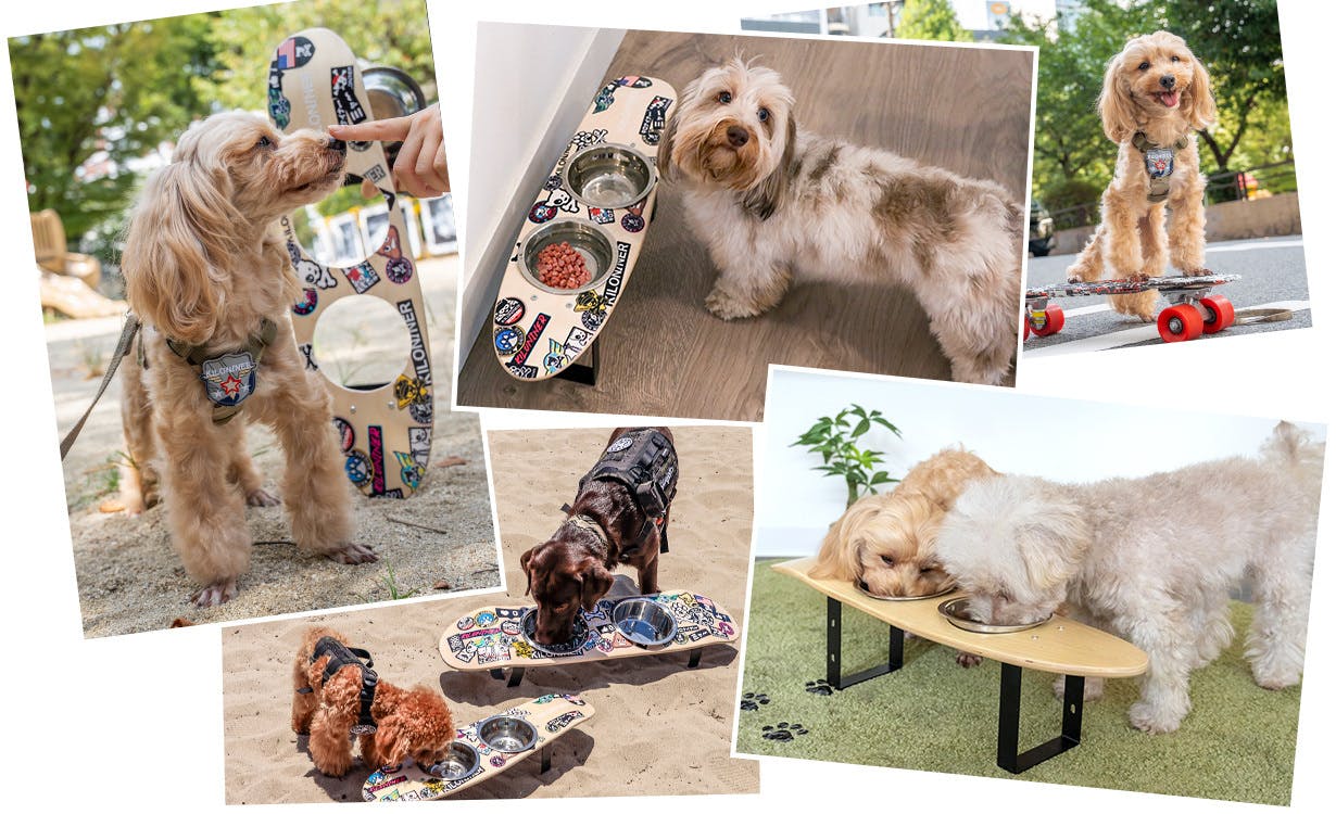 お店の看板犬・源ちゃんがごはんを食べるとき、頭を低くして食べにくそうにしている姿を見て、「もっと快適な食事スタイルを提供できないか」「気に入ったデザインにできないか」と模索してきました。