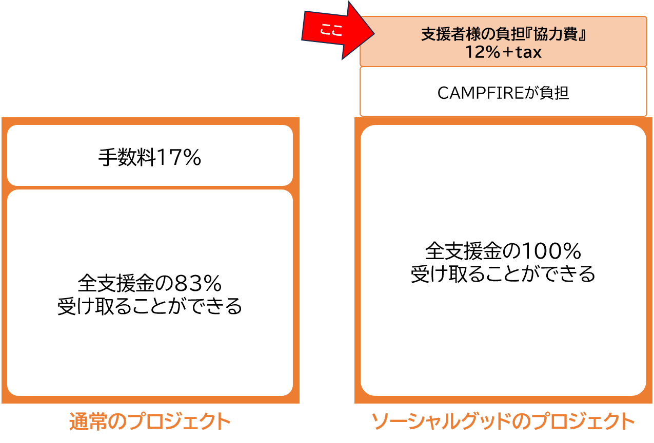 ・ソーシャルグッドのプロジェクト:集まった支援金の100%が受け取れる。その代わりに、支援してくださる方に「協力費」として支援額の「12%+税」を負担いただく(残りはCAMPFIREが負担)仕組みになっている