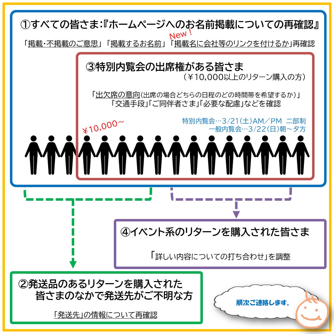 これらを踏まえて、すべての方に再度「お名前掲載・不掲載のご意思」「掲載名」「開催名へのリンク貼り付け」について再確認させていただきます。