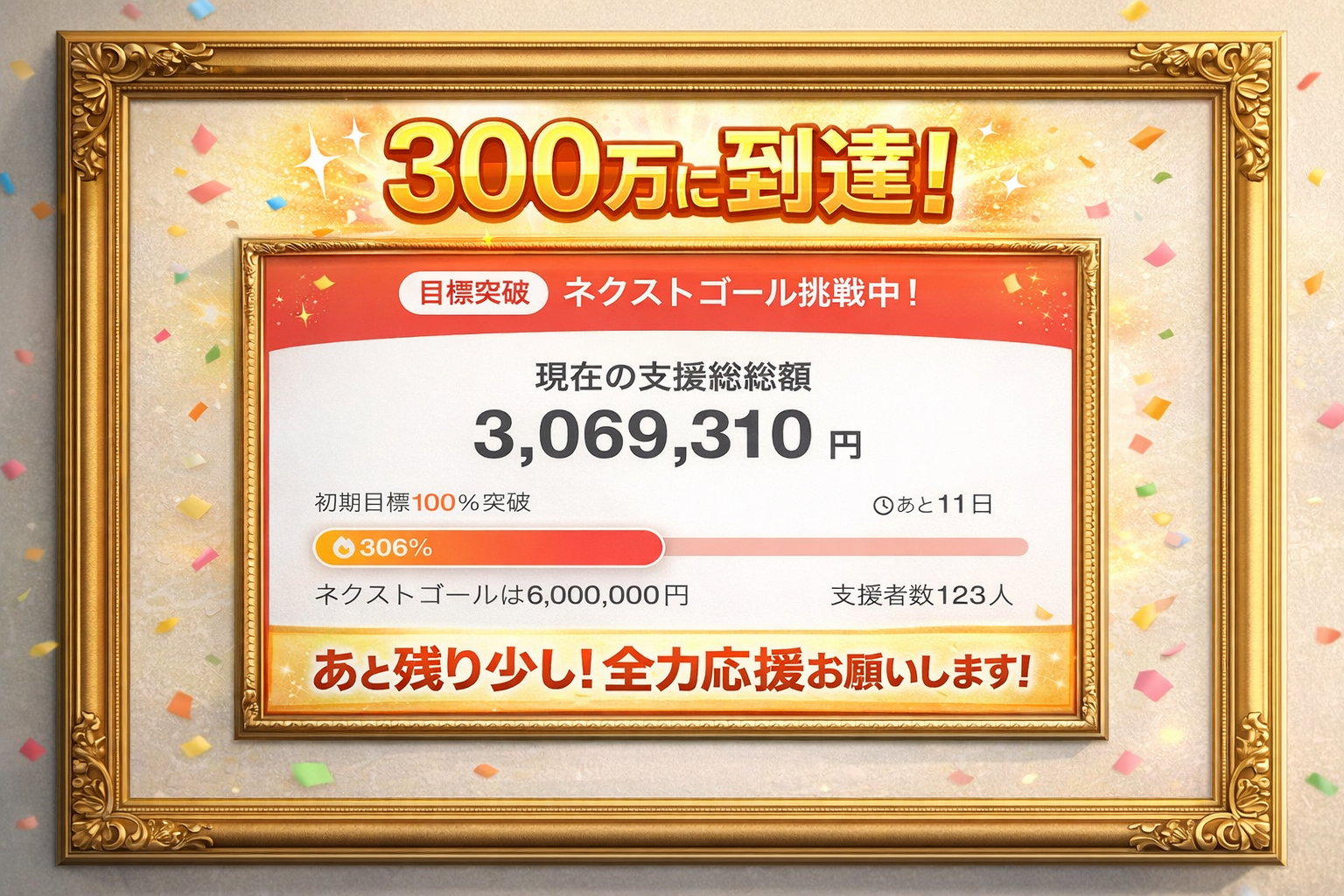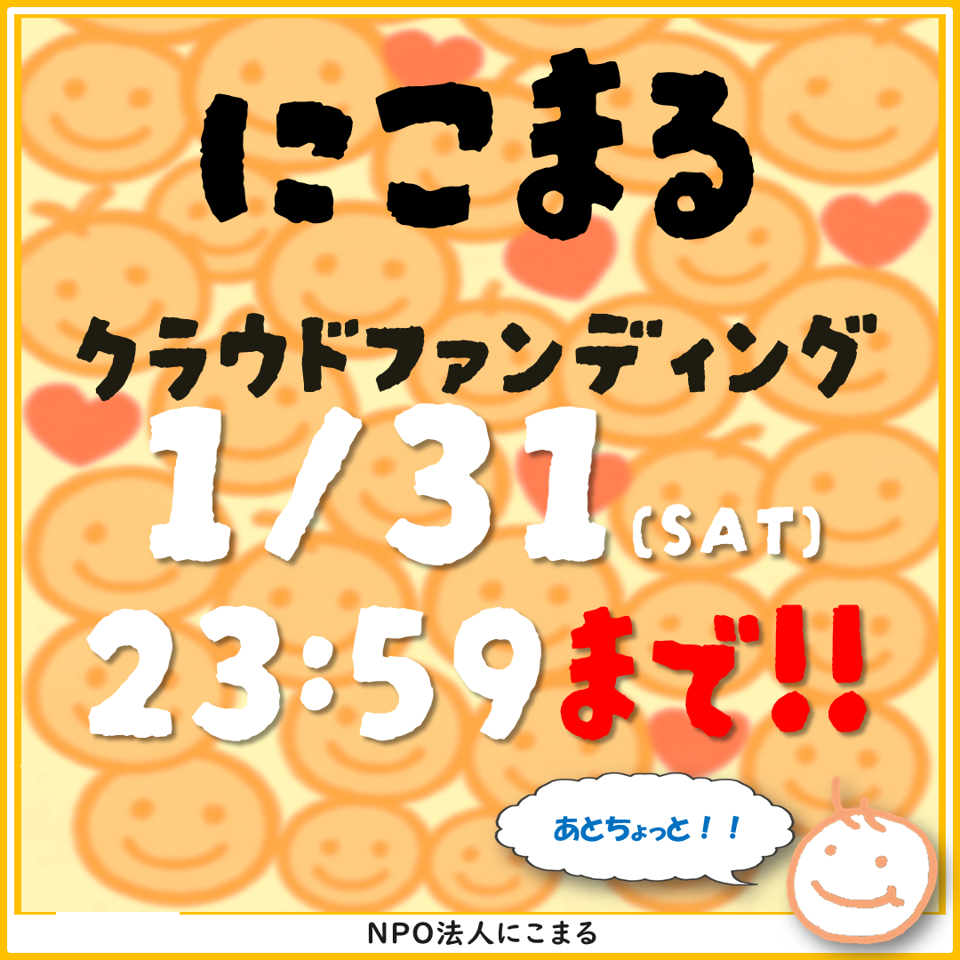 『にこまる応援団』のみなさまこんにちは。いつも、私たちのプロジェクトに興味・関心を寄せていただきありがとうございます。そして、一緒にこの『ワルダクミ』を楽しんでくださりありがとうございます。1月19日(火) とうとう300万円に到達しました!!!これでようやく、ネクストゴール600万円の半分。2台の天井走行リフト設置費用の半分というところです。すごいことなのですが…まだなんです。『にこまる応援団』の団員が足りません。もっと増員の必要があります。『夢の実現に向けた資金』の総額も足りません。もっと集める必要があります。あと11日で何が出来ようか!いやいや、出来ることはある!『にこまる応援団』総動員で、このプロジェクトの最後の追い込みをかけていきましょう!とにかくシェア拡散と宣伝をするキャンペーン!!応援団のみなさまがつながっている、多くの『まだ"にこまる“と縁が結ばれていない方々』と素敵な縁が結ばれますように。今日から最終日の1月31日(土)23:59まで、応援団の皆様に最後の追い込み要因になっていただきたい!「わたし、クラファン支援したんだー!”にこまる“のプロジェクト面白いんだよー!」「よかったらCAMPFIREのマイページ見てあげてよー!」「すてきな夢に向かって突き進んでるんだよー!」という一言と共に、「クラウドファンディングのマイページ見てみてよ!」「障害の重い子どもたちが生活するときの課題を、地域を巻き込みながら協力し合いながら解決しようとしてるんだよ!」「介助での入浴ってすっごい大変なのに、なかなかできるサービスが無いんだ」「障害のあるなしにかかわらず、“ごちゃまぜ”にどんな人でも集えるようなカフェスペースを作るんだって」こんなことを、お友達へつぶやいてみたり、SNSに投稿したりしてください!にこまる応援団として、ちょっとしたインフルエンサーになっちゃってください!!*この画像を転送しちゃうのもアリです!!どんどん、シェアや拡散や宣伝をお願いします。【重要】ちょっとしたお断りとご理解のお願い実は今回の挑戦にあたり、何名かの方から同じ内容でご相談を受けましたのでそちらについてお伝えします。≪手数料について≫今回のプロジェクトは、『CAMPFIRE for Social Goog』に認定されています。こちらは、社会課題の解決にとりくむプロジェクトオーナー(今回は”にこまる“)に1円でも多くの寄付を届けるための仕組みです。プロジェクトオーナーの負担を「0円」にするための対策が取られています。それが、「手数料」の設定です。・通常のプロジェクト:集まった支援金の中から「手数料」として17%をCAMPFIRE様に支払う=支援金の83%が受け取れる。・ソーシャルグッドのプロジェクト:集まった支援金の100%が受け取れる。その代わりに、支援してくださる方に「協力費」として支援額の「12%+税」を負担いただく(残りはCAMPFIREが負担)仕組みになっている“にこまる“のプロジェクトが『社会課題の解決に取り組む大切な内容だ』ということが認められて喜ばしい一方で、「ご支援金+協力費」というご負担を支援者さまに科してしまっているという心苦しい事実もあります。どうぞ、こちらの点をご確認の上、ご納得の上でご支援していただければ幸いです。引き続き、ご理解とご協力をよろしくお願いします。NPO法人にこまる