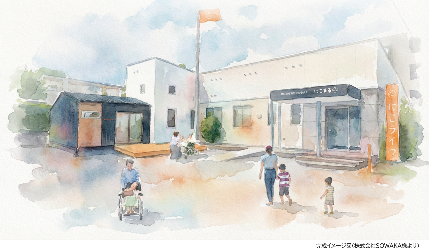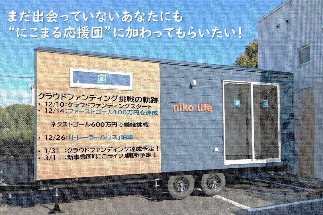 ご支援と全力応援をありがとうございます。クラウドファンディングスタートから丸っと一日以上がたち…「こんなにたくさんの人がページを見てくれて気にかけてくれてるんだ!」「"にこまる”の想いはちゃんと届いてるんだ!」って、ものすごい勇気をもらっています。そして、工事を請け負ってくださっている株式会社SOWAKA様より新事業所『にこライフ』のイメージ図を頂戴しました。このイメージ図を見てみなさん想像してください…「ニコニコの利用者様が天井走行リフトに乗ってご機嫌にお風呂に向かう様子」を。「トレーラーハウスの中でお茶しながら談笑するご家族さまや近所の方々の姿」を。NPO法人にこまるの理念は、『ワクワクする未来とつながる地域を、想像し創造する』です。ただ想像するにとどまらず、創造していくところが"にこまる”の強みですから。いまみなさんが想像したその笑顔を実現すべく、新しい『にこライフ』を創造していきましょう。まずはファーストゴールまで頑張るぞ!!
