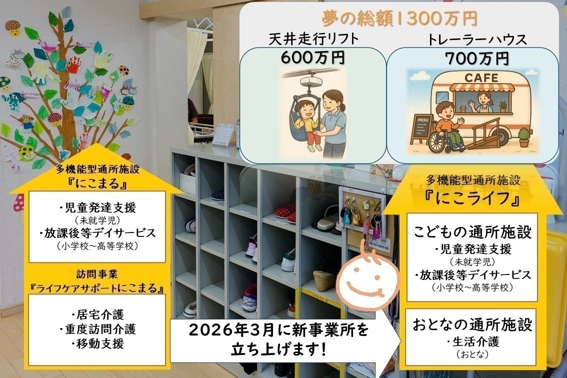 私たちの最終的なゴールは、天井走行リフト(600万円)導入に加え、地域との「ごちゃまぜの場」を生み出すトレーラーハウス型「にこカフェ」(700万円)の設置も含めた、1,300万円の実現です。