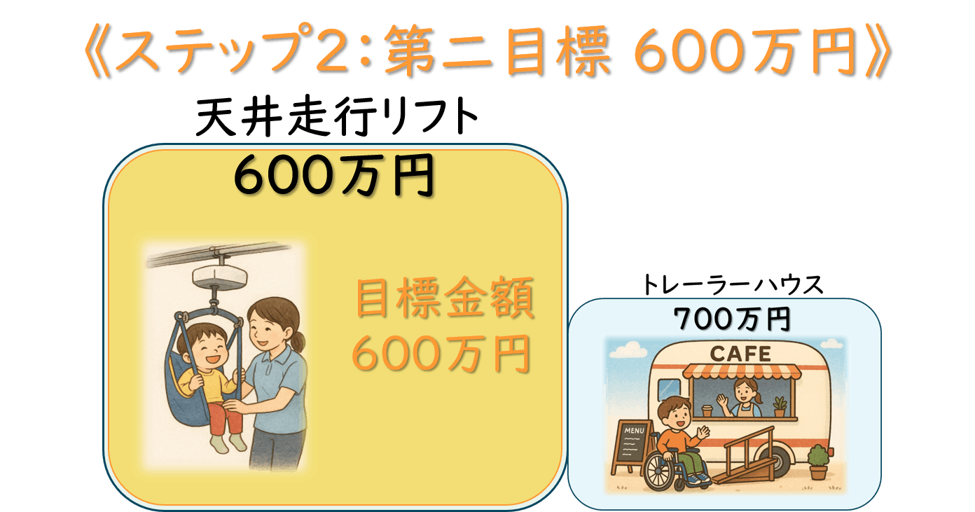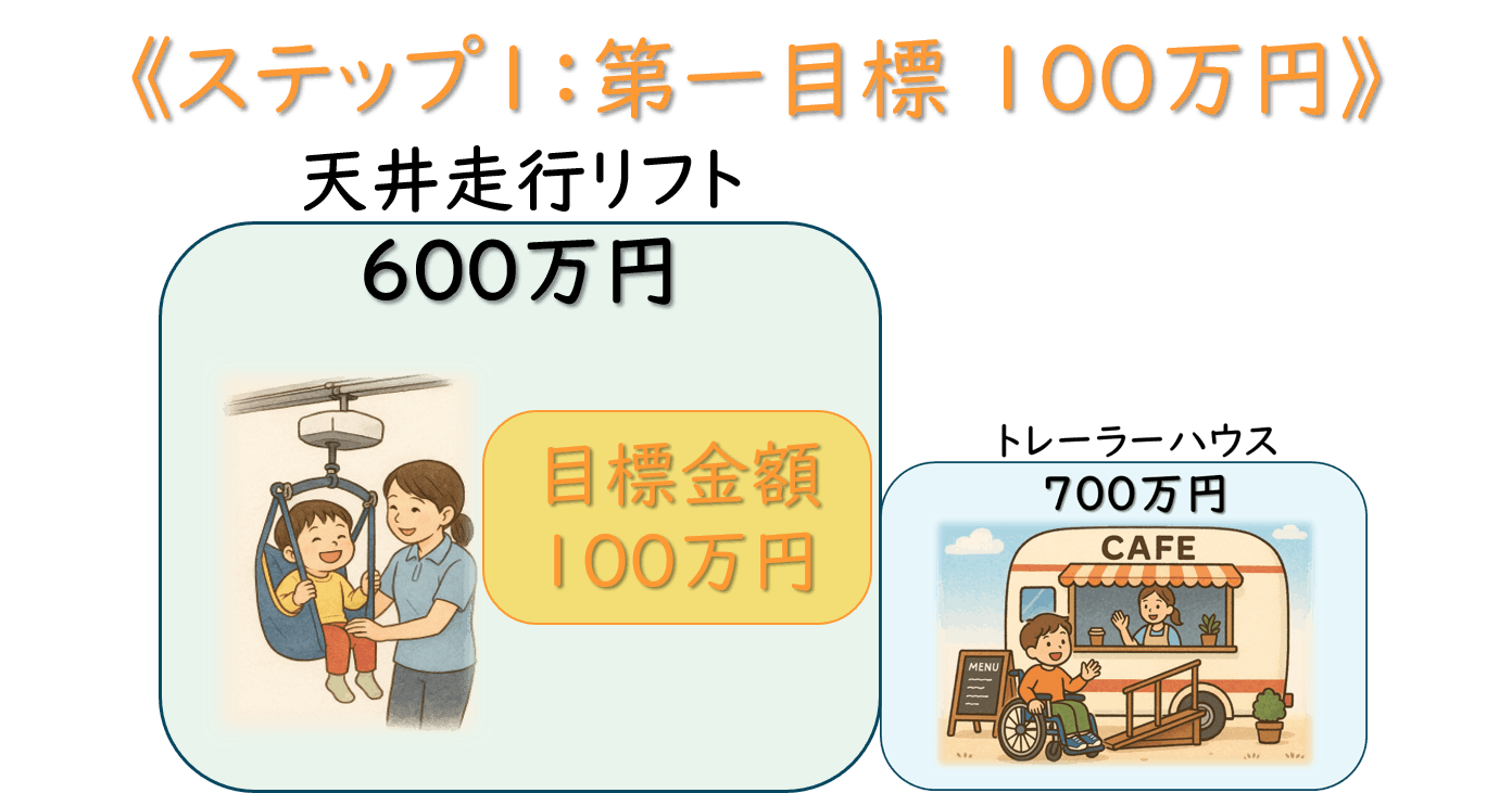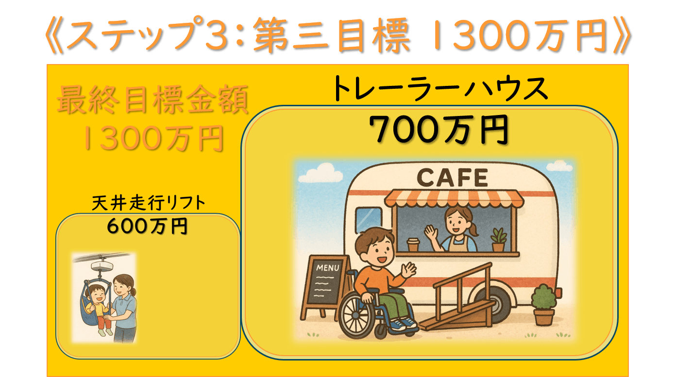 私たちの最終的なゴールは、天井走行リフト(600万円)導入に加え、地域との「ごちゃまぜの場」を生み出すトレーラーハウス型「にこカフェ」(700万円)の設置も含めた、1,300万円の実現です。