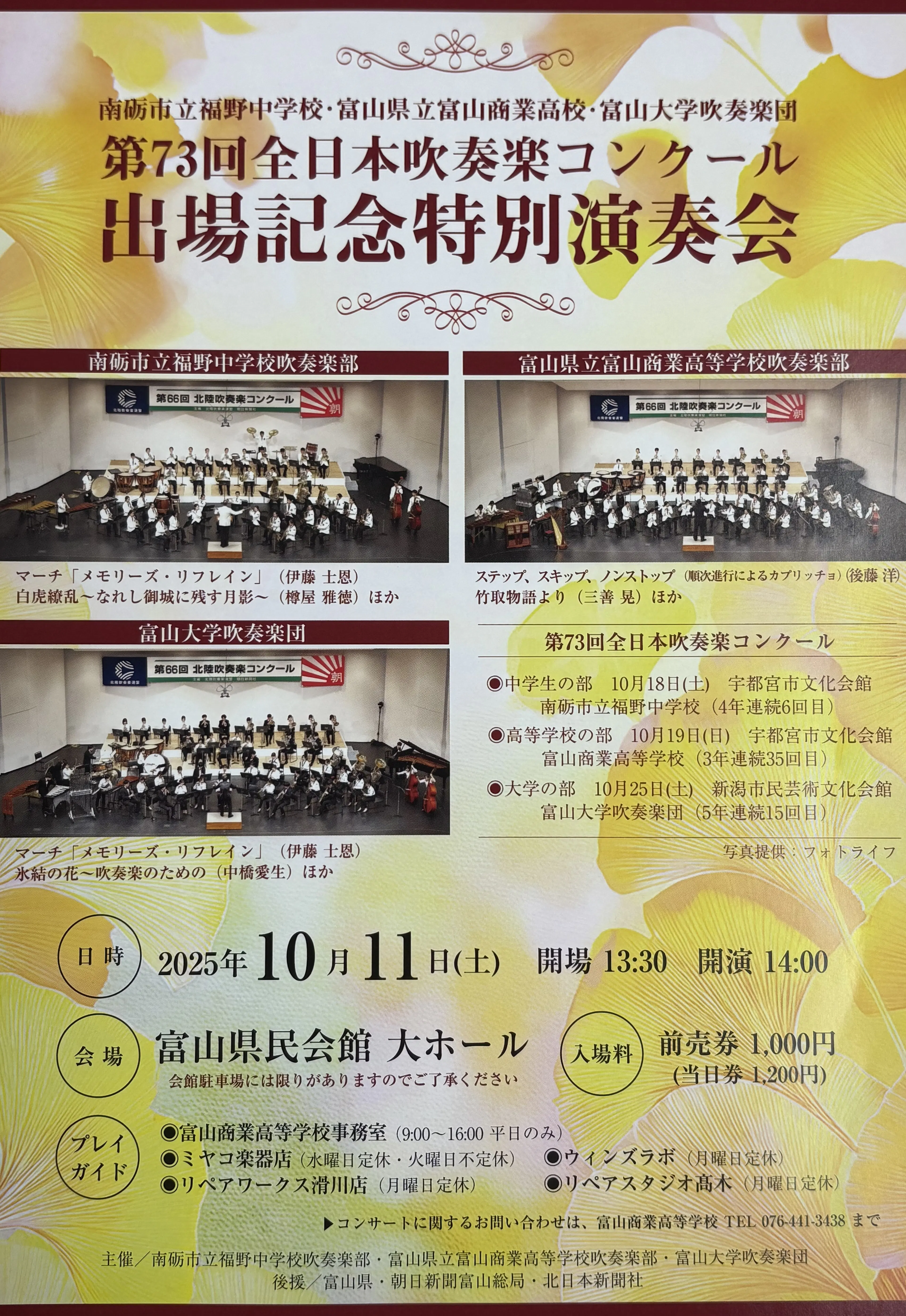 出演 福野中学校・富山商業高校・富山大学吹奏楽団