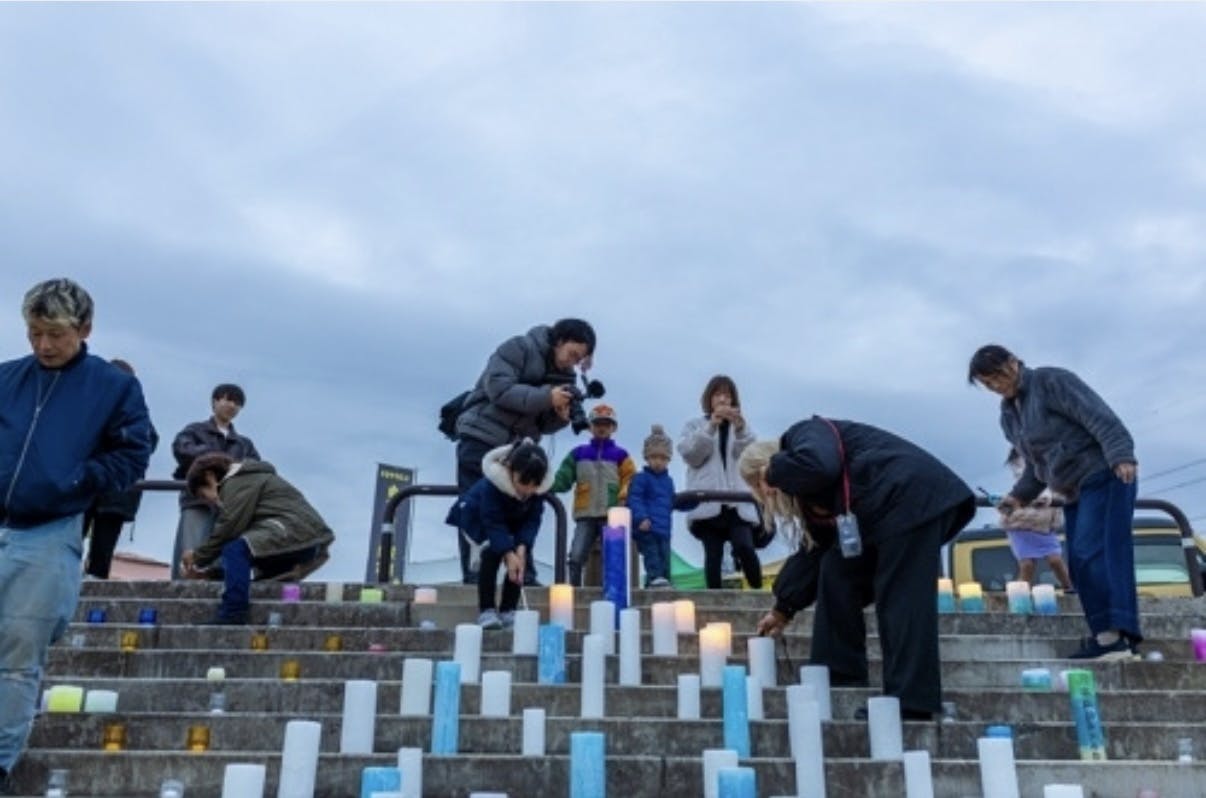 周囲に並んだカラフルなキャンドルは、子どもたち、地域の方々、参加者一人ひとりの個性の光。色も形も違う灯りが、同じ空間で揺らめく景色は、このキャンドルナイトが目指してきた「ひとつの灯りが、まち全体を照らす」という想いそのものでした。この灯りは、支援してくださった皆さま一人ひとりの想いの結晶です。今回の活動報告として、この夜に生まれた光の物語は、ご支援・ご協力、そして当日力を貸してくださった皆さまのおかげです。