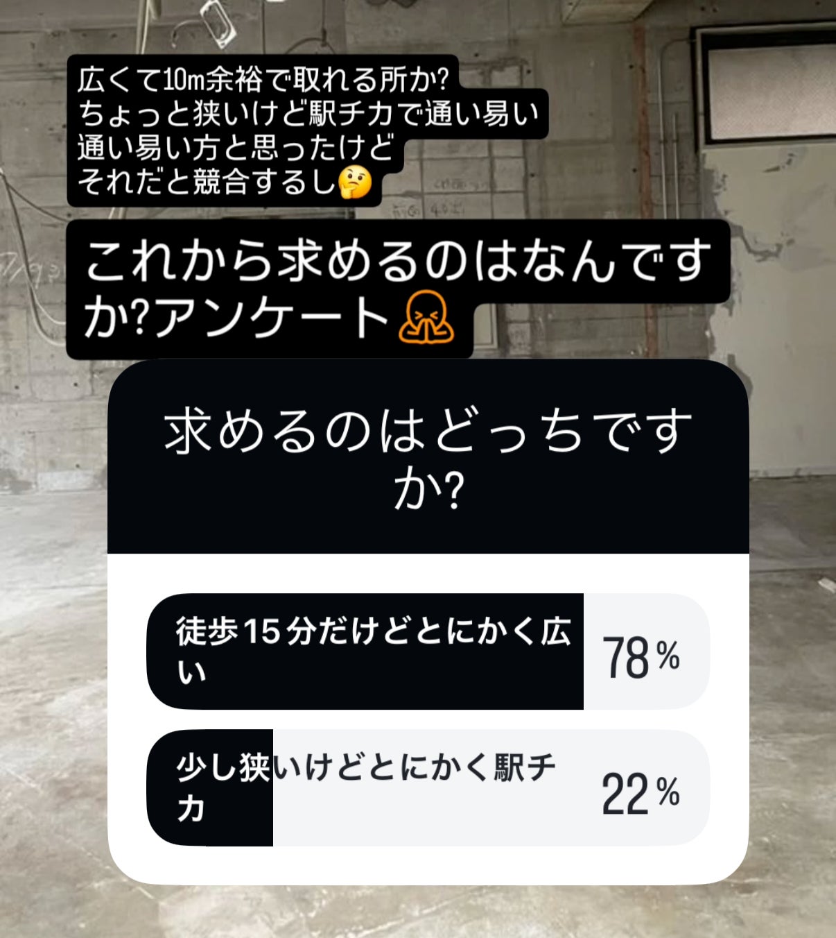 求めてのは【駅チカだけど少し狭い場所】or 【駅から徒歩15分だけど広い場所】どっちですか?