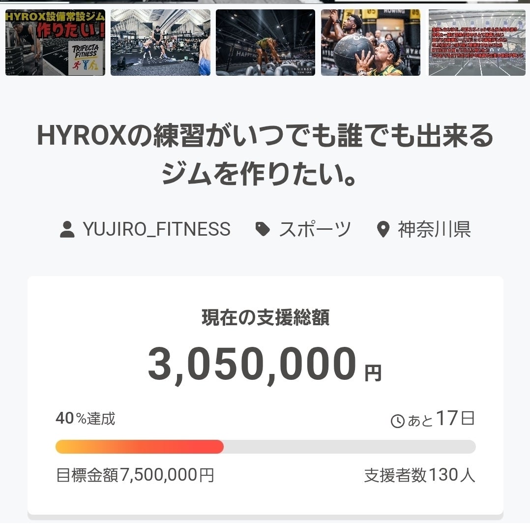 多くの方から求められている、HYROX常設の本格ジムを必ず実現します。この挑戦を成功させるためには、私一人の力では足りません。