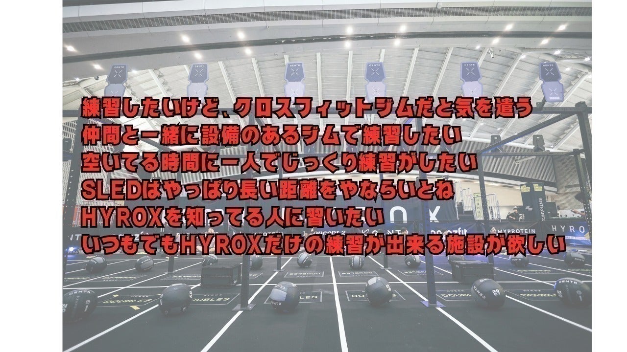 自分のやりたい練習メニューではなかったり、オープンジムの時間でも、スレッドや距離を長くとるようなHYROXの種目は、使用ができなかったり、他の利用者とスペースをシェアする必要があることから、制限されたスペース内で工夫して代替のトレーニングをするなど、中々思うようなトレーニングができない課題があります。