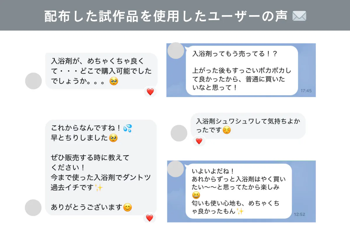 実は入浴剤の試作品を、ごく一部の方にお渡ししたところ、想像以上に多くの反響をいただきました。