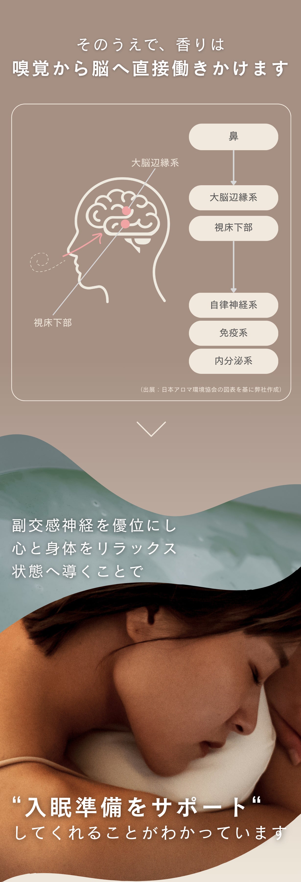 重すぎず、軽すぎず、すっと香りが入り込み、眠りの入り口に身体をゆるめるような体験を提供します。