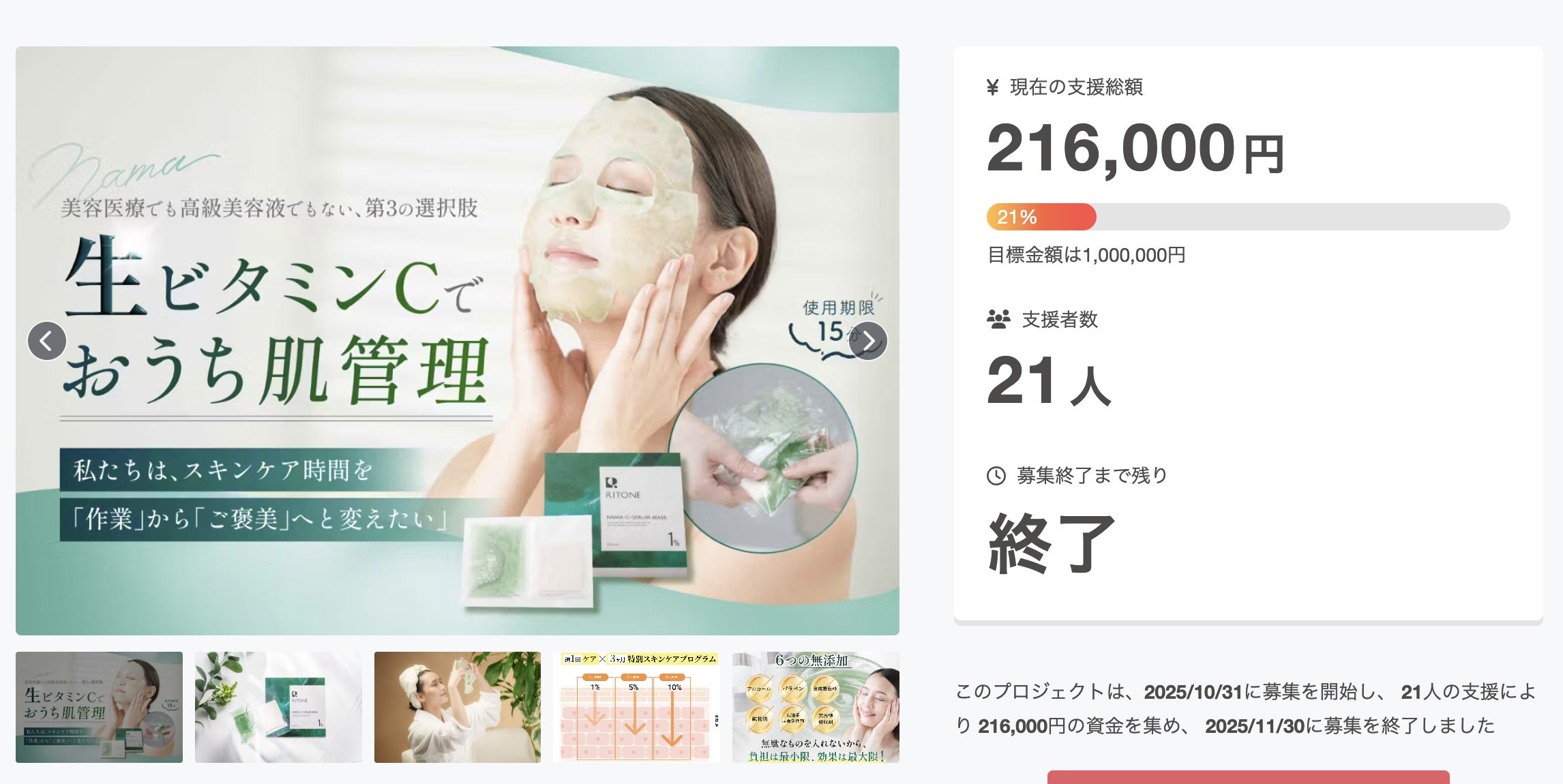 2025/12/01 11:53お世話になります。RITONEの岡本です。11月30日 23:59をもちまして、クラウドファンディングの挑戦を終了いたしました。21名、216,000円のご支援をいただき、心から感謝申し上げます。目標金額には到達いたしませんでしたが、まだ世に出ていない、知名度もない私たちのブランドを信じ、「期待しているよ」と託してくださった方が21名もいらっしゃること。その事実が、何よりの財産であり、私たちの自信となりました。本当に、ありがとうございます。皆様からいただいたご支援は、一人でも多くの肌悩みを救うための活動資金として、大切に使わせていただきます。ここからが、RITONEの本当のスタートです。ご支援いただいた皆様は、創業期を支えてくださった最初の理解者です。その期待を裏切らないよう、「鏡を見るのが楽しみになる毎日」を必ずお届けします。【今後のスケジュールについて】リターンの発送準備を順次開始いたします。お手元に届くまで、今しばらくお待ちください。「守る」だけじゃない、「育てる」スキンケアへ。これからのRITONEの成長を、どうか温かく見守っていただけますと幸いです。引き続き、よろしくお願いいたします。RITONE代表 岡本 もっと見る