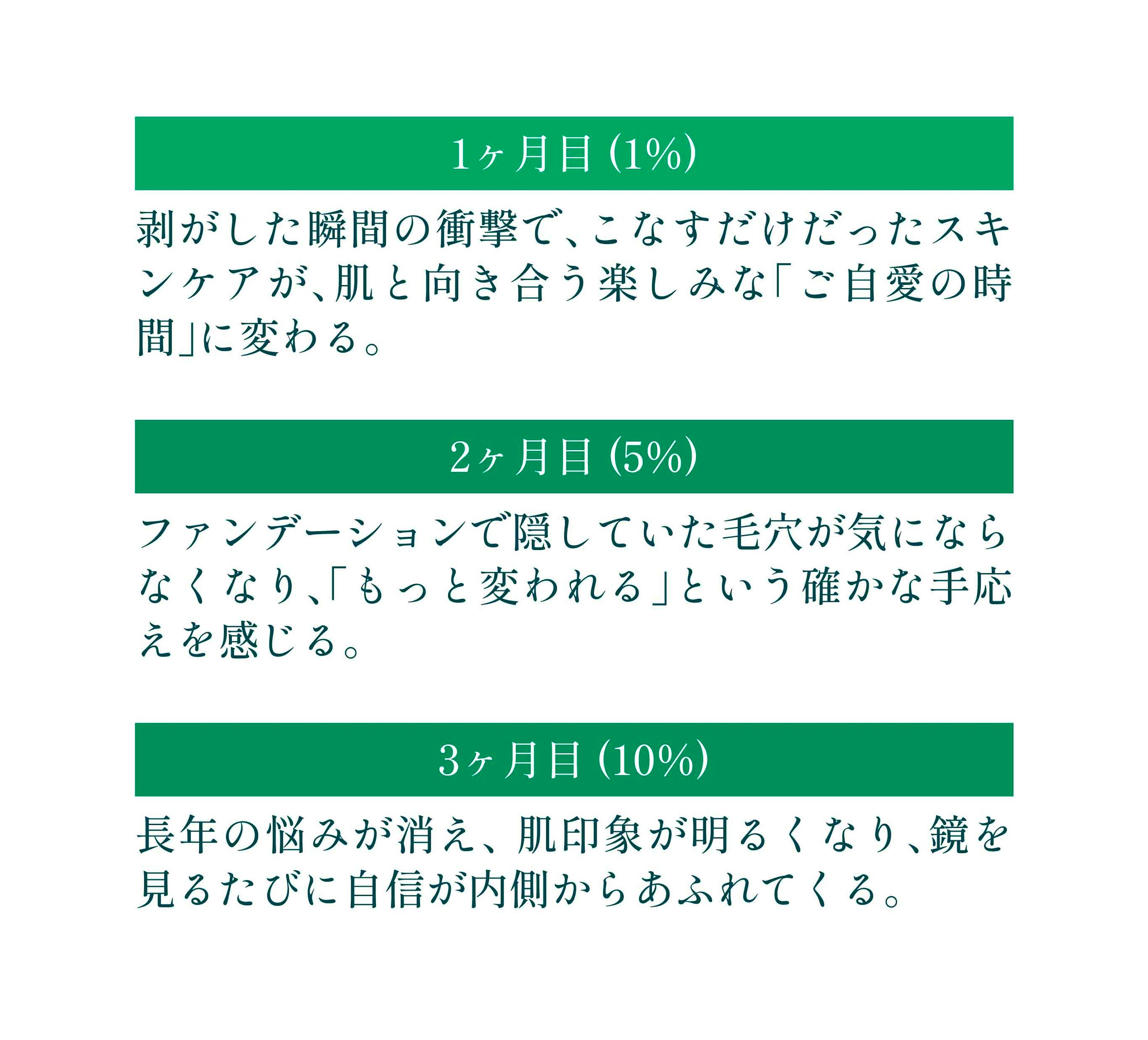 1%で肌を目覚めさせ、5%で肌の可能性を引き出し、そして10%で感動的な領域へ。この段階的なアプローチこそが、肌に無理なく、しかし確かな力を呼び起こすための、唯一の答えなのです。