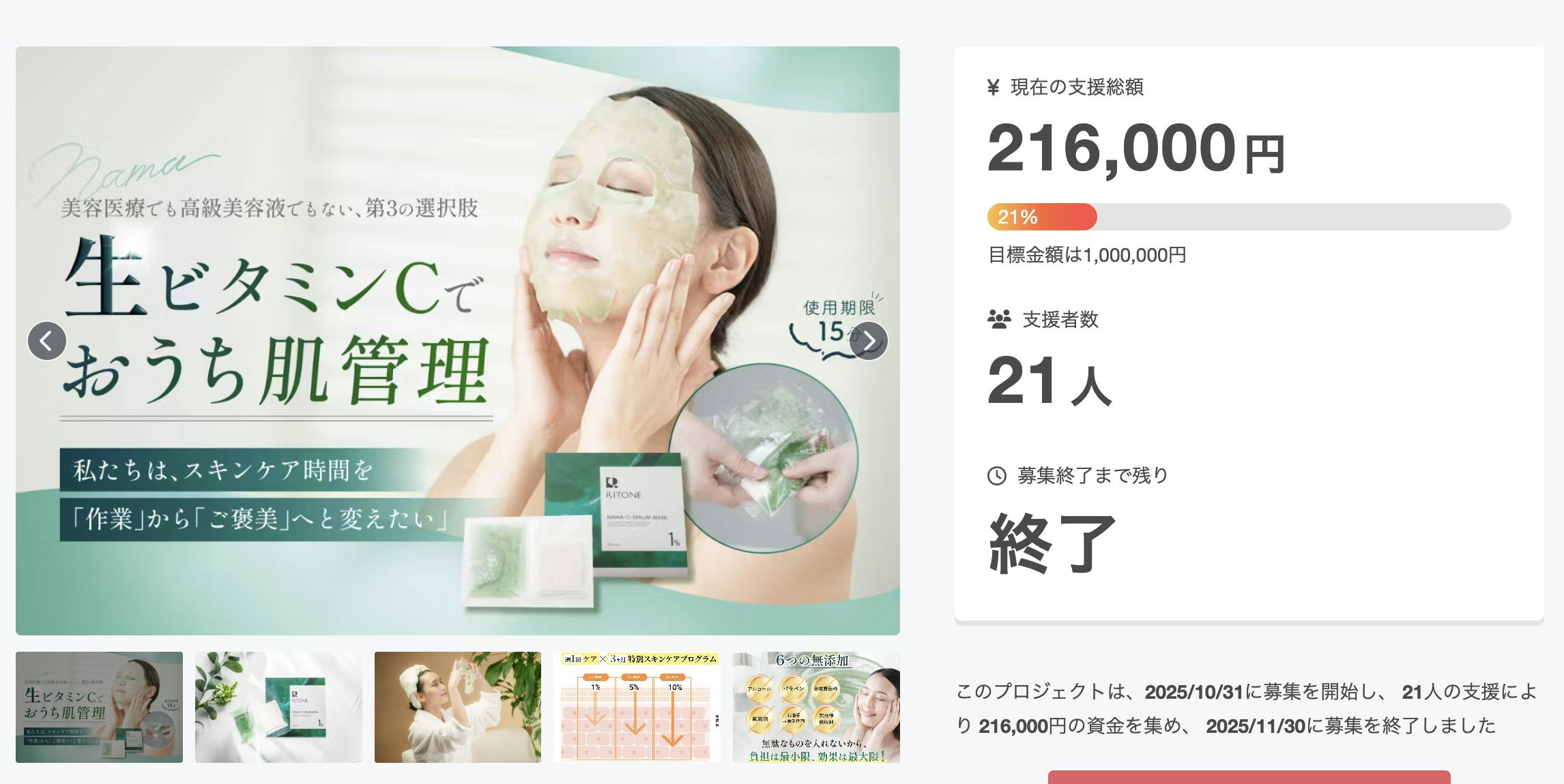 2025/12/01 11:53お世話になります。RITONEの岡本です。11月30日 23:59をもちまして、クラウドファンディングの挑戦を終了いたしました。21名、216,000円のご支援をいただき、心から感謝申し上げます。目標金額には到達いたしませんでしたが、まだ世に出ていない、知名度もない私たちのブランドを信じ、「期待しているよ」と託してくださった方が21名もいらっしゃること。その事実が、何よりの財産であり、私たちの自信となりました。本当に、ありがとうございます。皆様からいただいたご支援は、一人でも多くの肌悩みを救うための活動資金として、大切に使わせていただきます。ここからが、RITONEの本当のスタートです。ご支援いただいた皆様は、創業期を支えてくださった最初の理解者です。その期待を裏切らないよう、「鏡を見るのが楽しみになる毎日」を必ずお届けします。【今後のスケジュールについて】リターンの発送準備を順次開始いたします。お手元に届くまで、今しばらくお待ちください。「守る」だけじゃない、「育てる」スキンケアへ。これからのRITONEの成長を、どうか温かく見守っていただけますと幸いです。引き続き、よろしくお願いいたします。RITONE代表 岡本 もっと見る