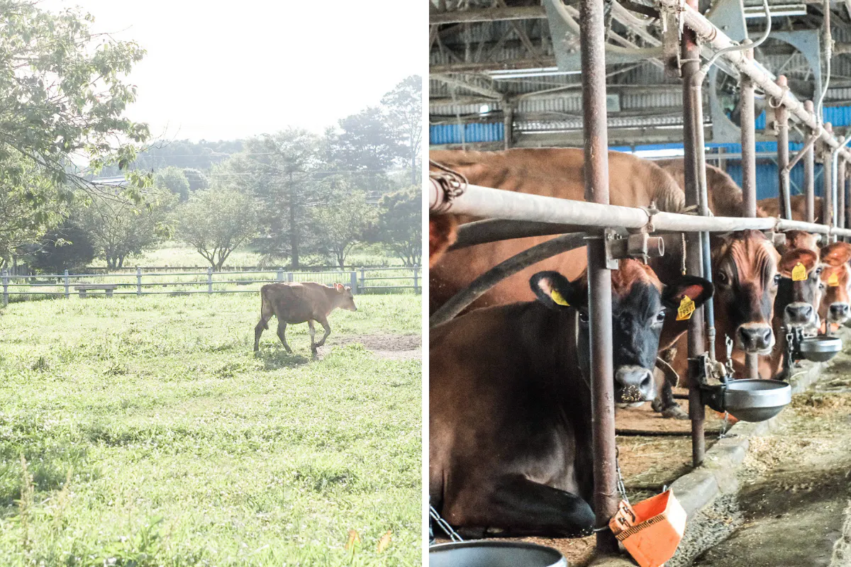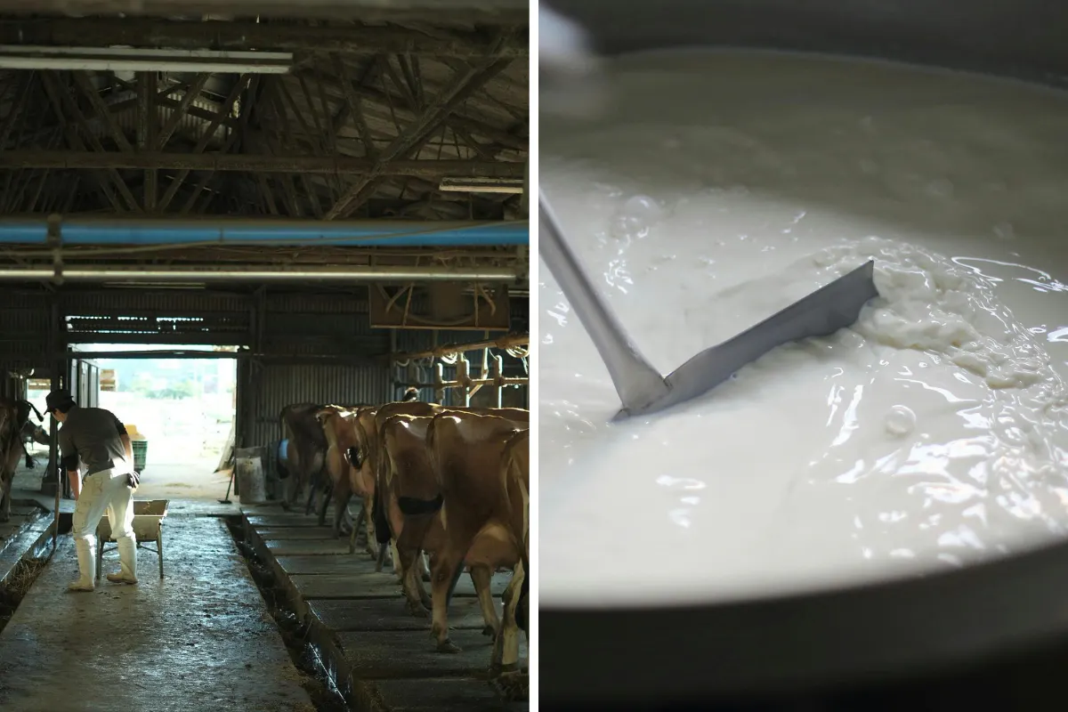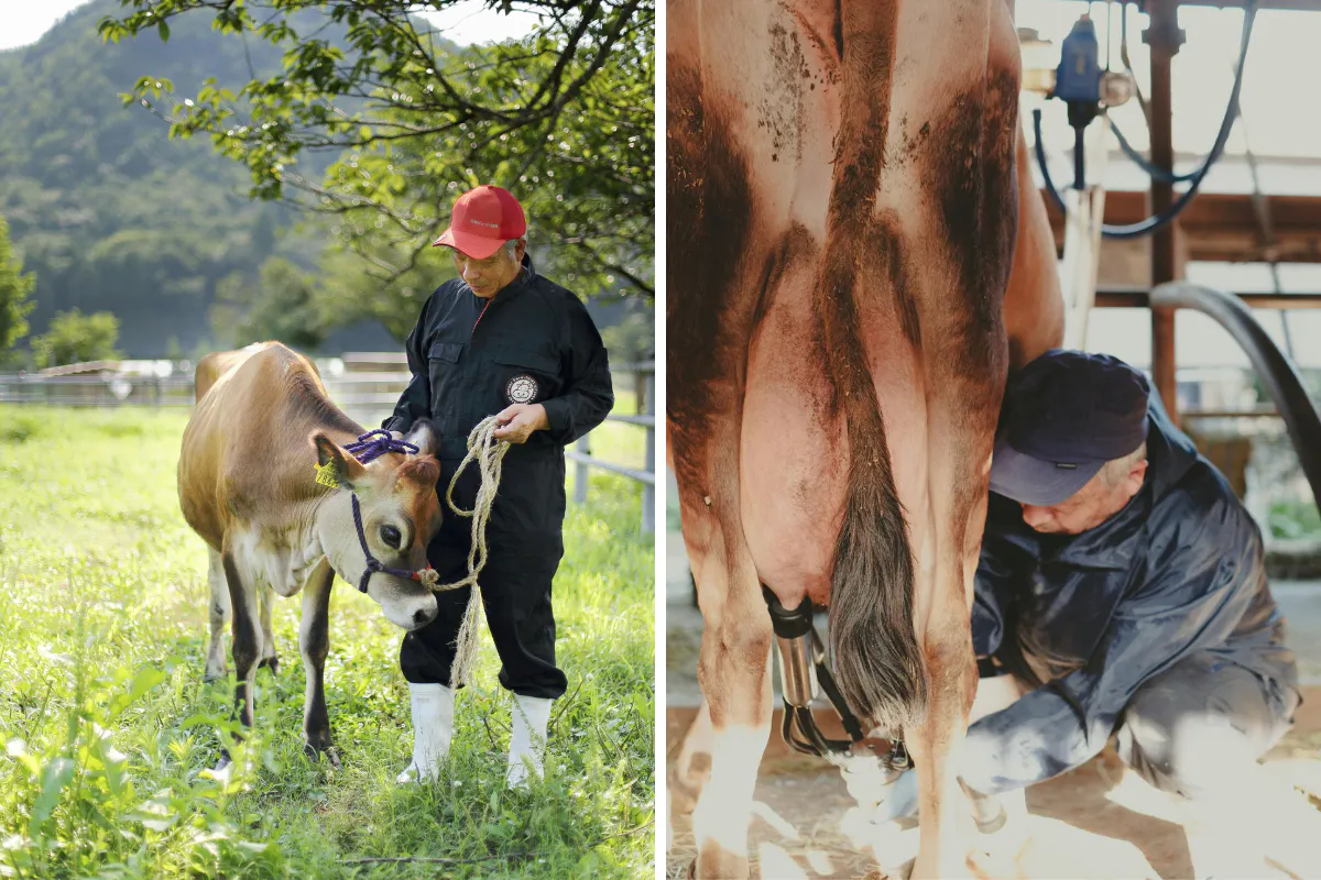 祖父の代から変わらない牛舎での作業/搾りたてのジャージー牛のミルク