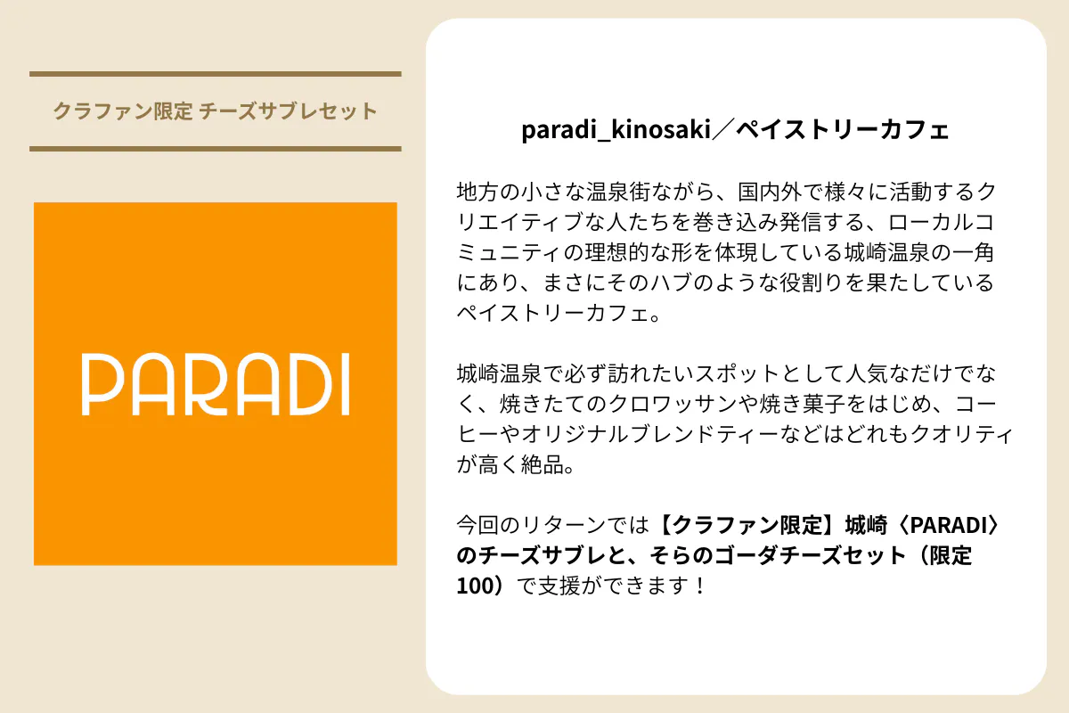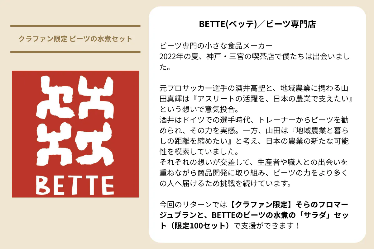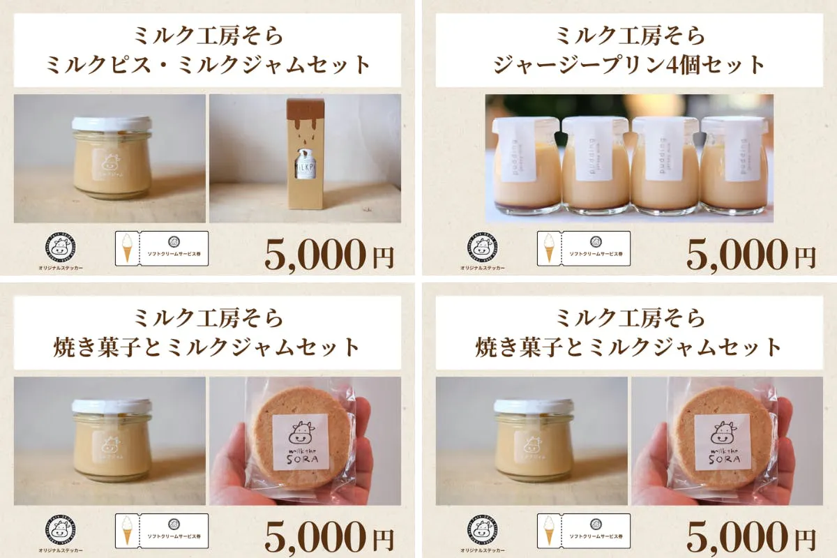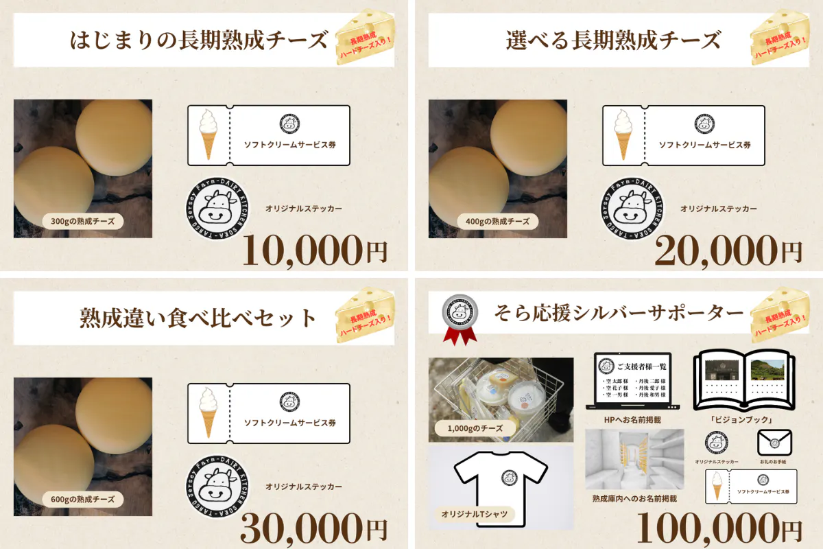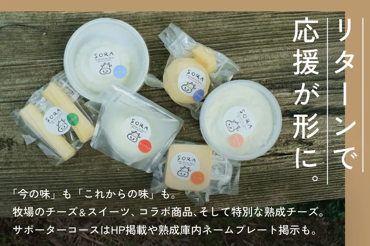 支援いただく方には、そらの“今の味”と“これからの味”を感じてもらえるよう、私たちのチーズやスイーツ、協力店とのコラボ商品、