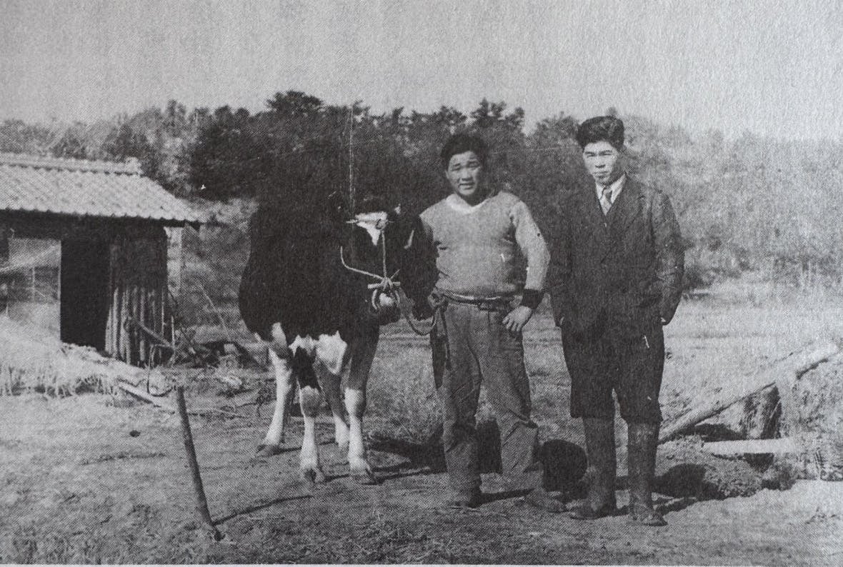 昭和24年早春頃、初めての乳牛を導入した当時の酪農の恩師と祖父(写真右)