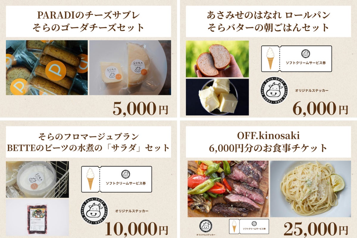 支援いただく方には、そらの“今の味”と“これからの味”を感じてもらえるよう、私たちのチーズやスイーツ、協力店とのコラボ商品、