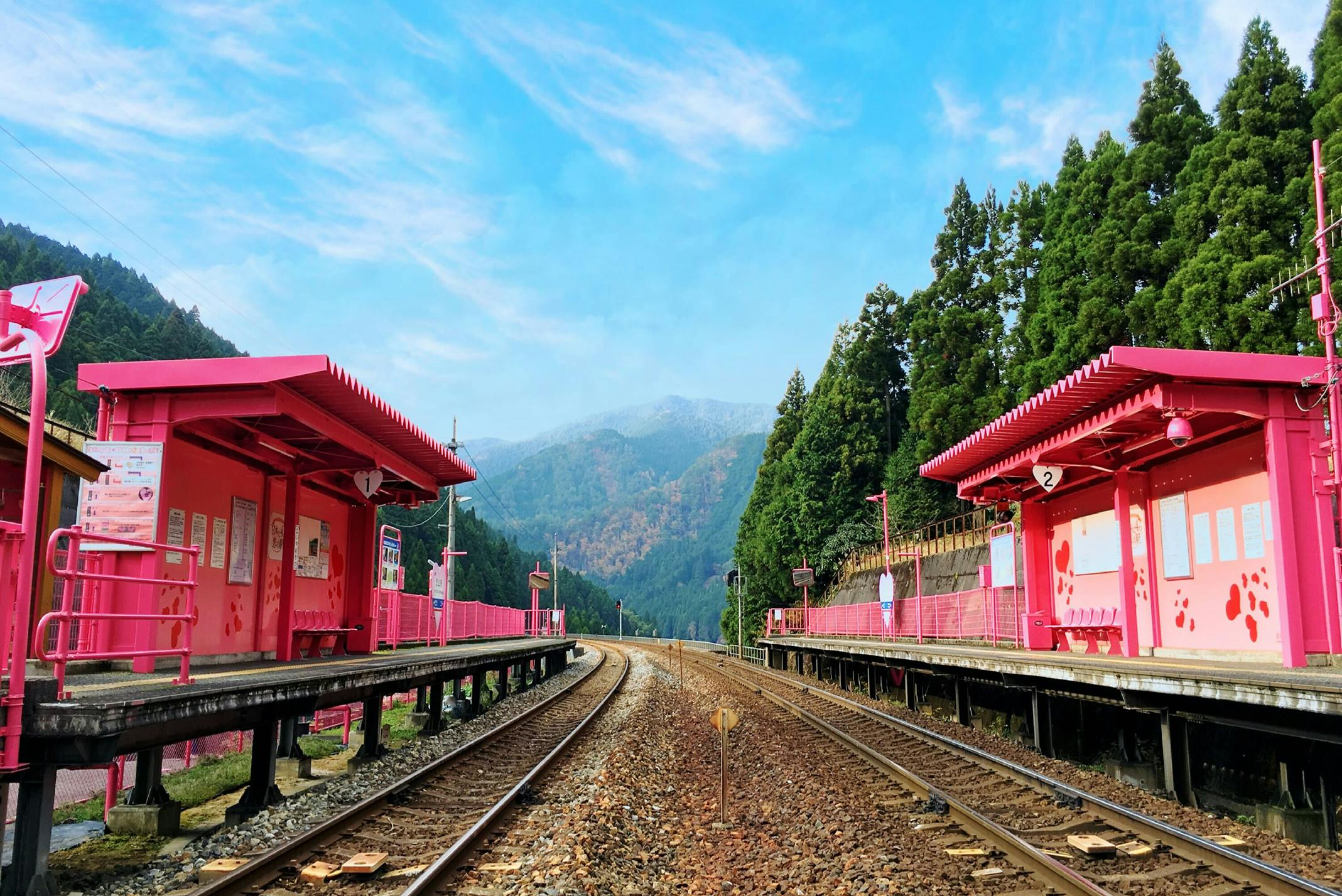 2013年、駅名標をハート型にリニューアルし、駅舎・フェンス・ベンチ・ゴミ箱まで、すべてをピンクに塗り替えました