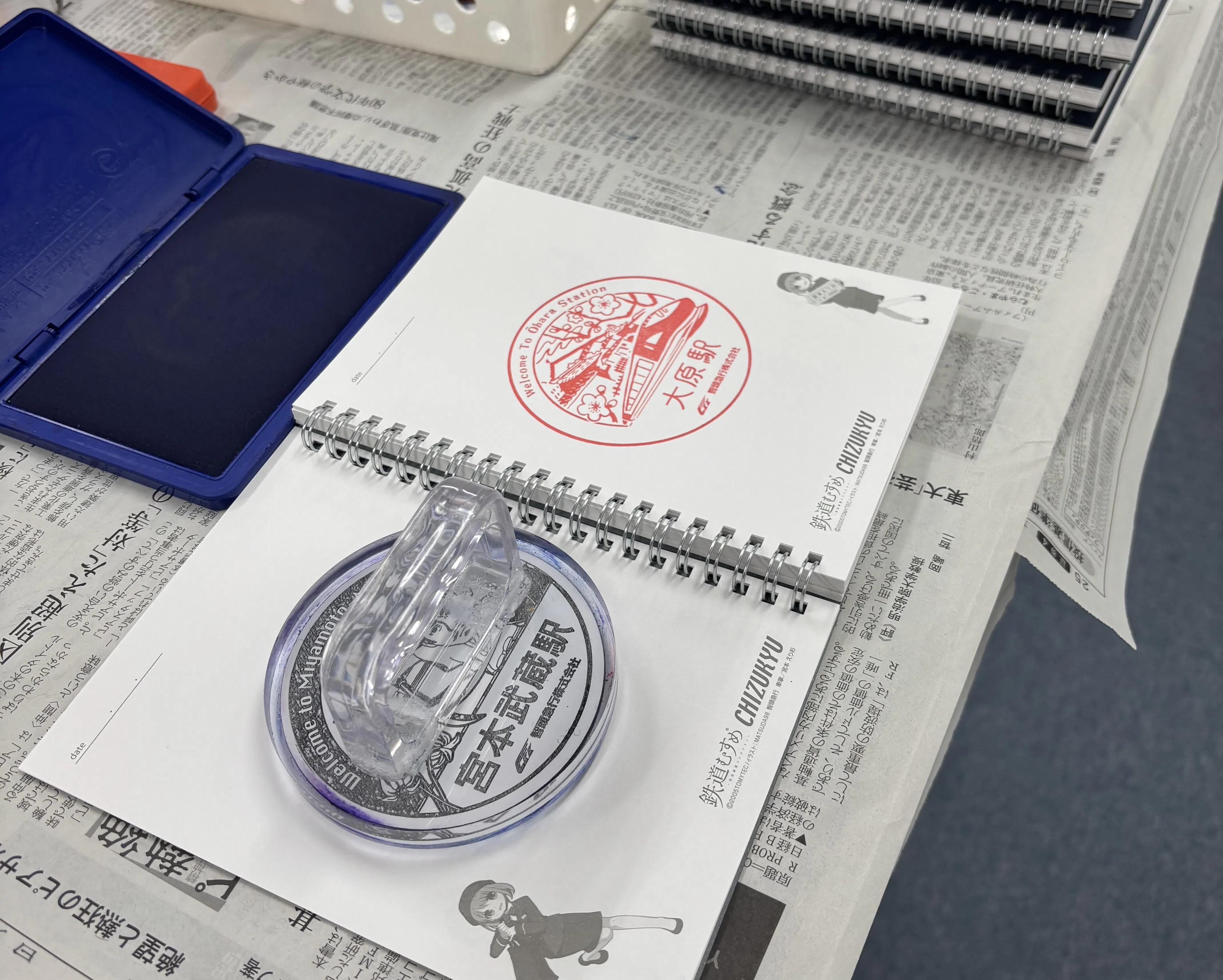 写真は、「駅スタンプコース」にご支援いただいた皆様へお送りする、冊子に智頭急行線各駅のスタンプが押印している様子です。一冊一冊、心を込めて準備を進めております。