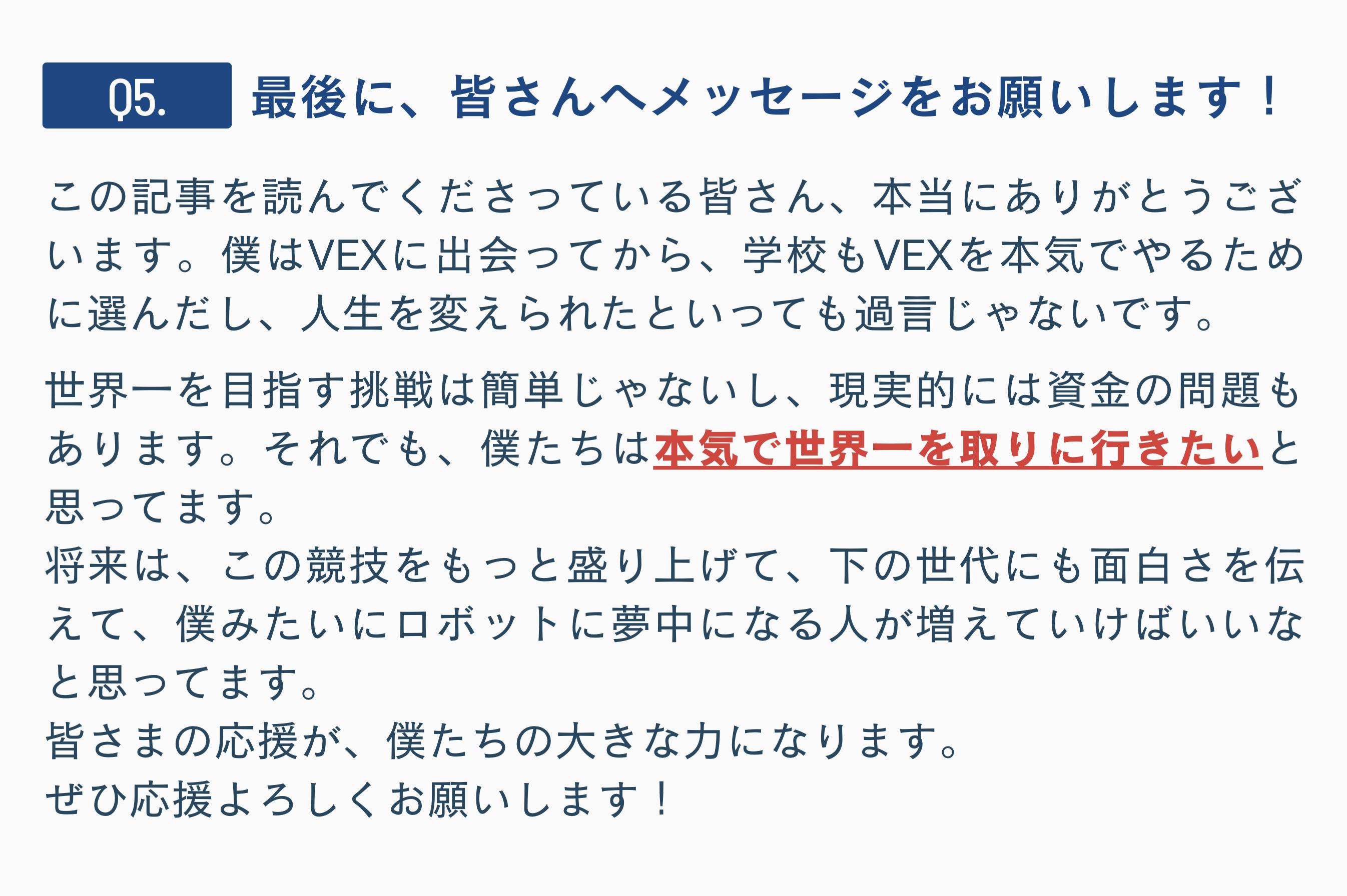 日頃より活動を支えてくださる皆さまへの感謝を胸に、私たちは VEX という手段を通じて、これからの世代に新たな道や可能性を伝えていきたいと考えています。単に結果だけを追い求めるのではなく、挑戦の過程を共有し、世界へ挑む価値を広げていくこと。それが私たちのミッションです。日本代表としての誇りを胸に、世界の舞台に挑みます。