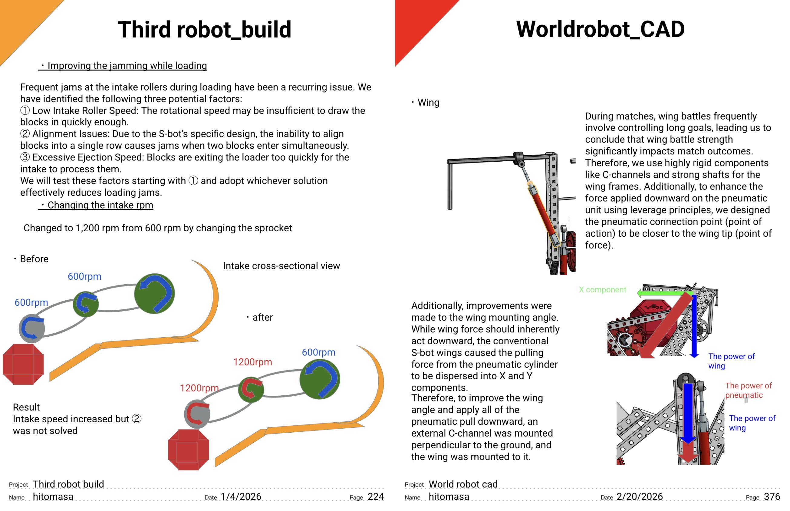 このノートは、チームメンバー自身が書き続けているもので、すでに400ページ以上に積み重なりました。そこには、ロボット開発の試行錯誤やアイデア、改善のプロセスがすべて記録されています。