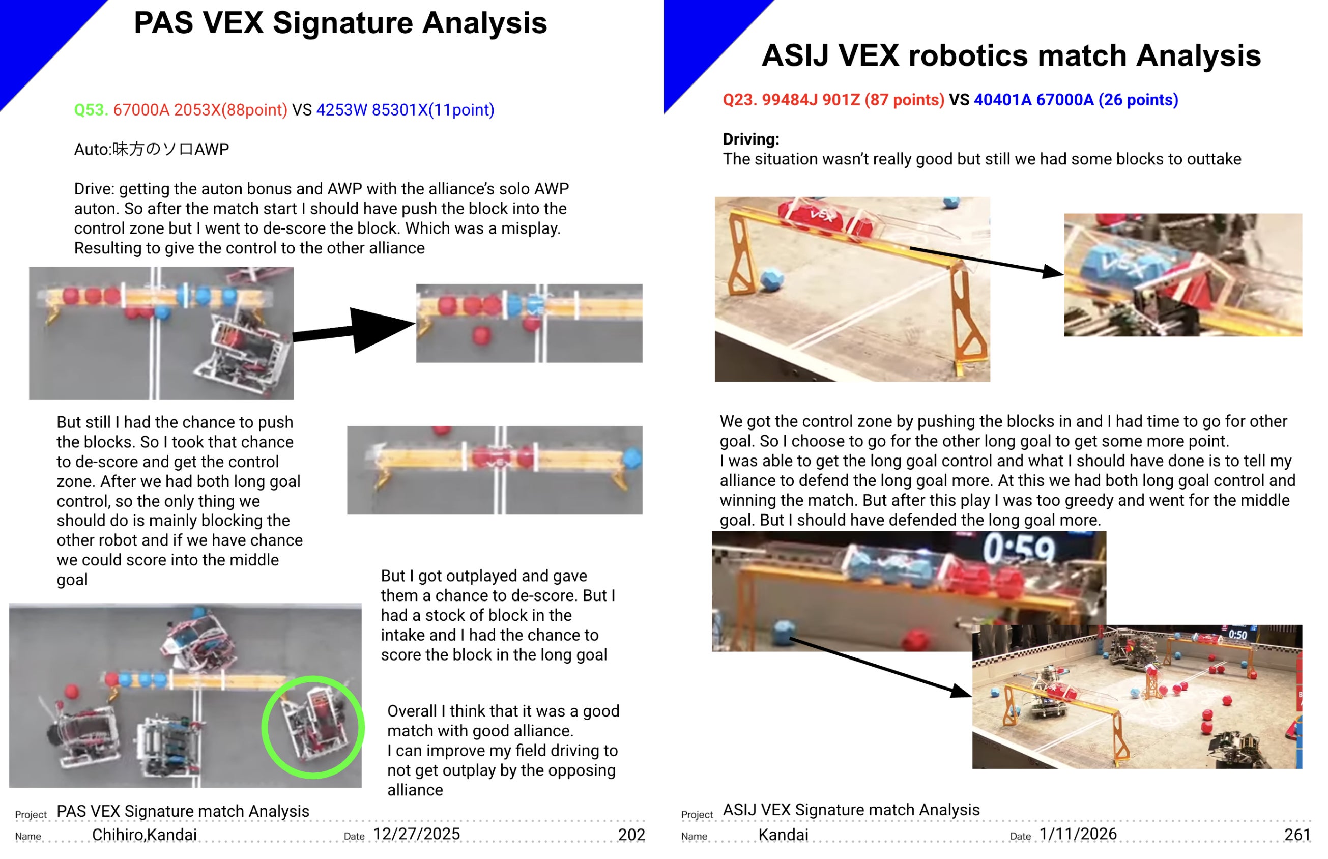 私たちが挑戦しているのは世界最大級のロボティクス競技大会である VEX V5RC です。世界各国から約20,000チーム以上が参加し、単にスキルや勝敗を競うだけでなく、エンジニアリングノートブック、インタビュー、チーム運営、資金調達や広報活動など、総合的な要素も評価される点が特徴です。