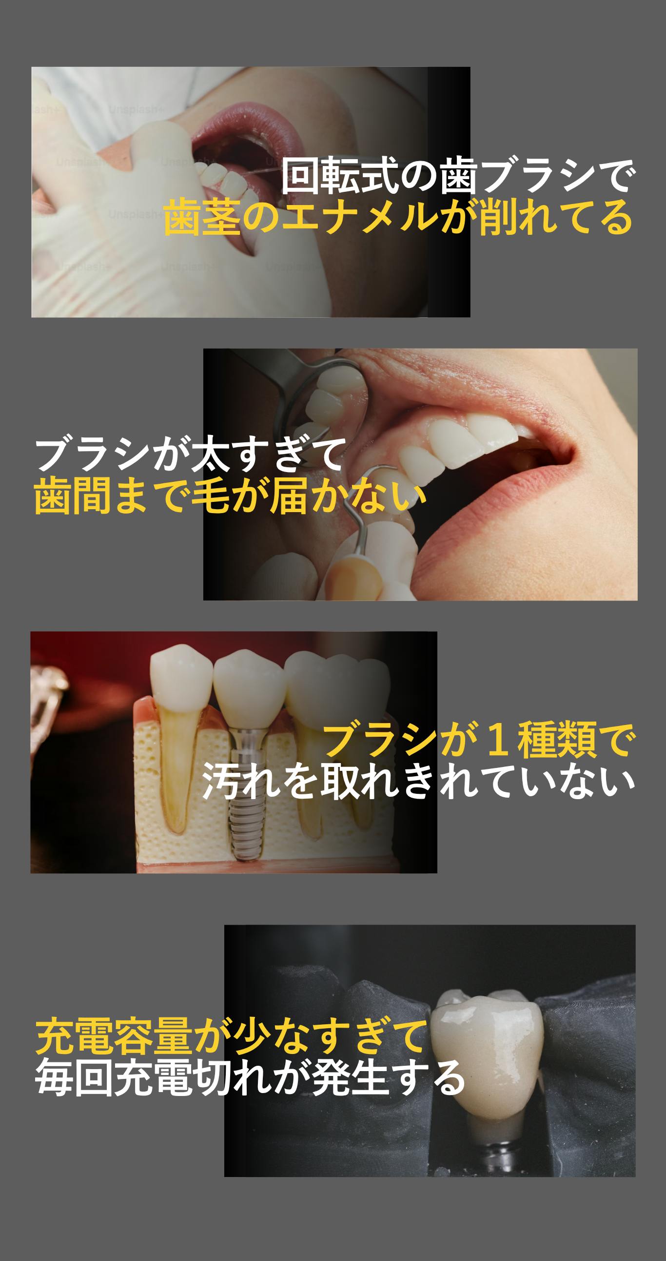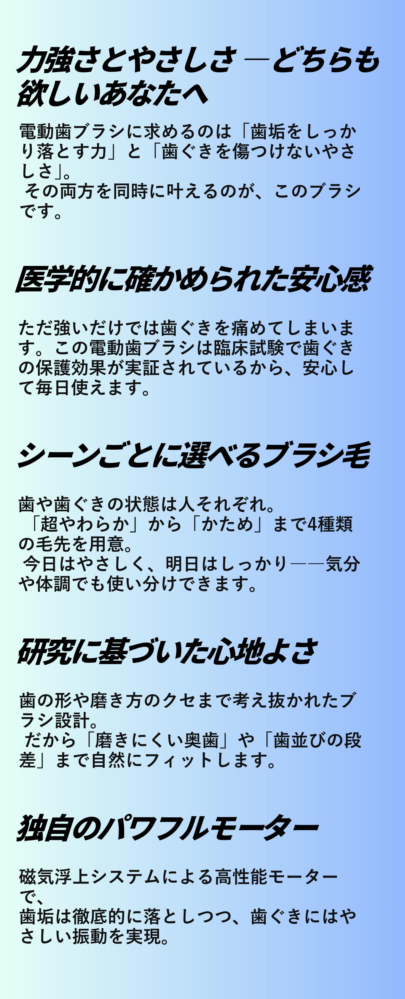 こうした課題を解決するために、強力な洗浄力と歯ぐきへのやさしさ、長時間使用可能なバッテリーを兼ね備えた新しい電動歯ブラシの開発が求められました。