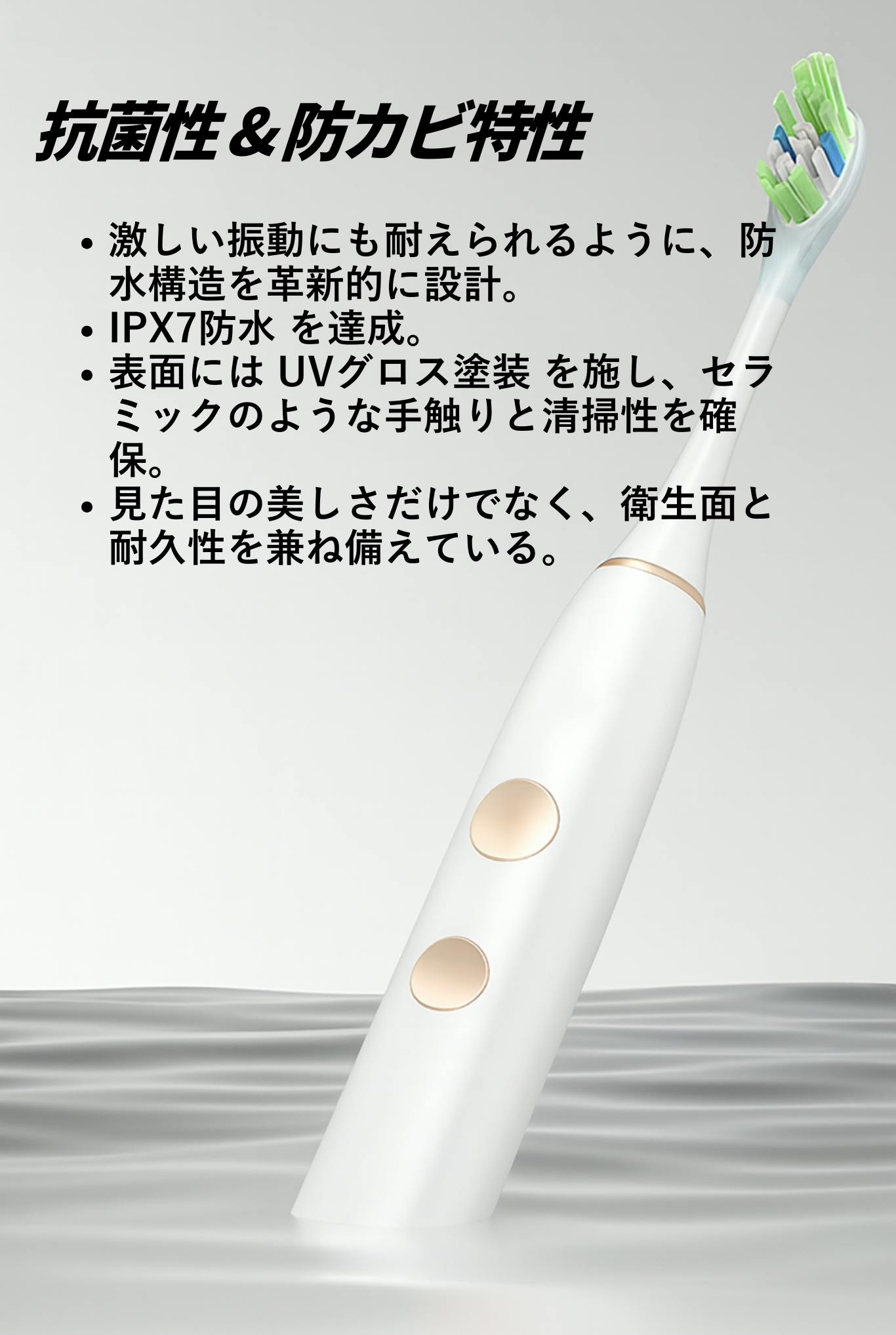 歯ブラシは口の中に直接触れるアイテムだからこそ、衛生面への配慮は欠かせません。抗菌機能を備えた電動歯ブラシは市場でも珍しく、「磨き × 清潔」両方を叶える価値ある1本として差別化されています。