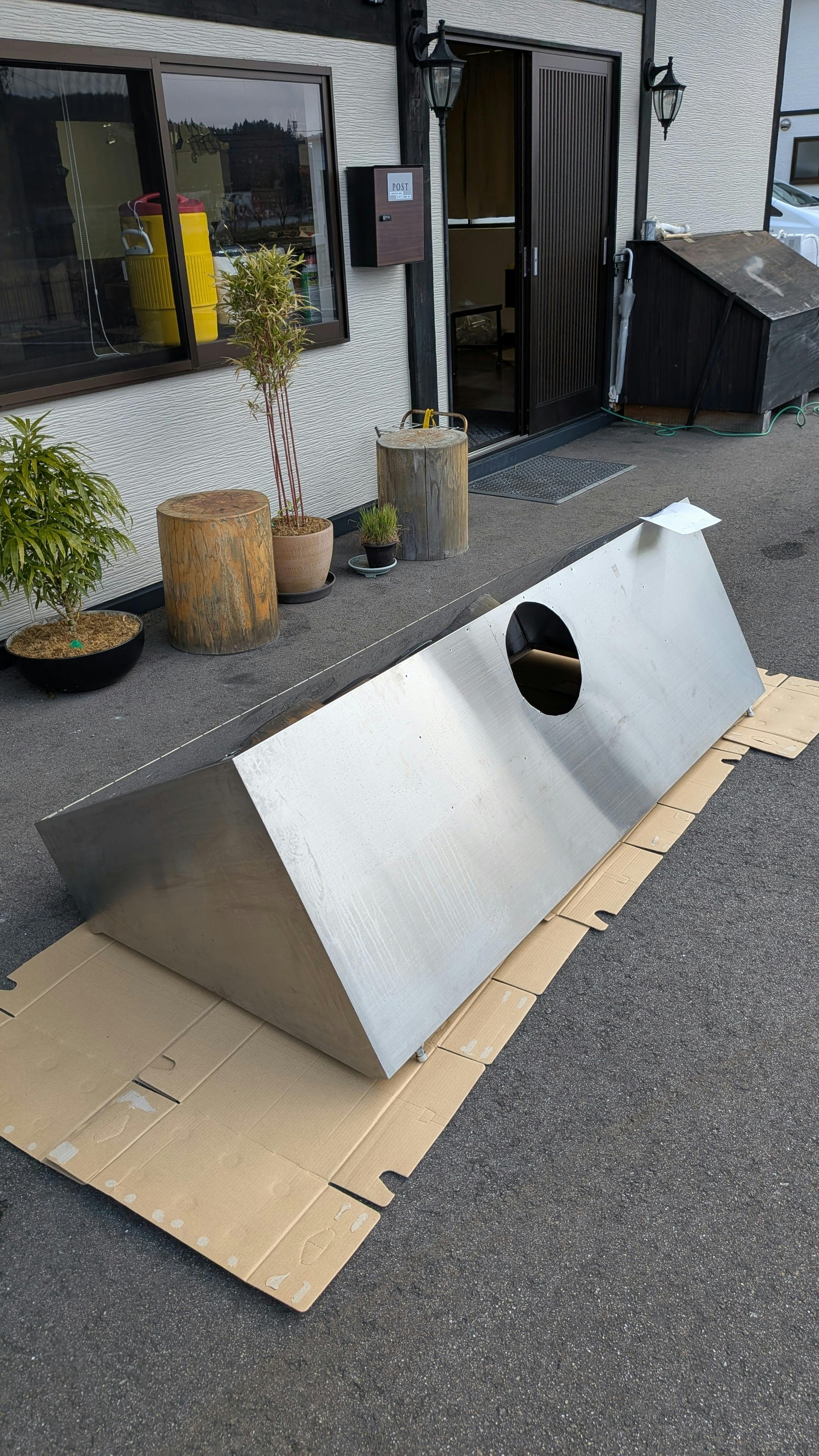 中古のレンジフードを購入して、自分たちで加工しました。といっても、私は研削砥石の資格がないので、墨出し担当!加工は夫が担当しました。