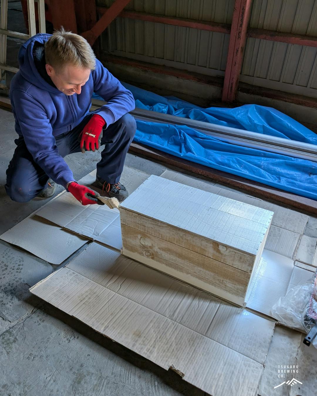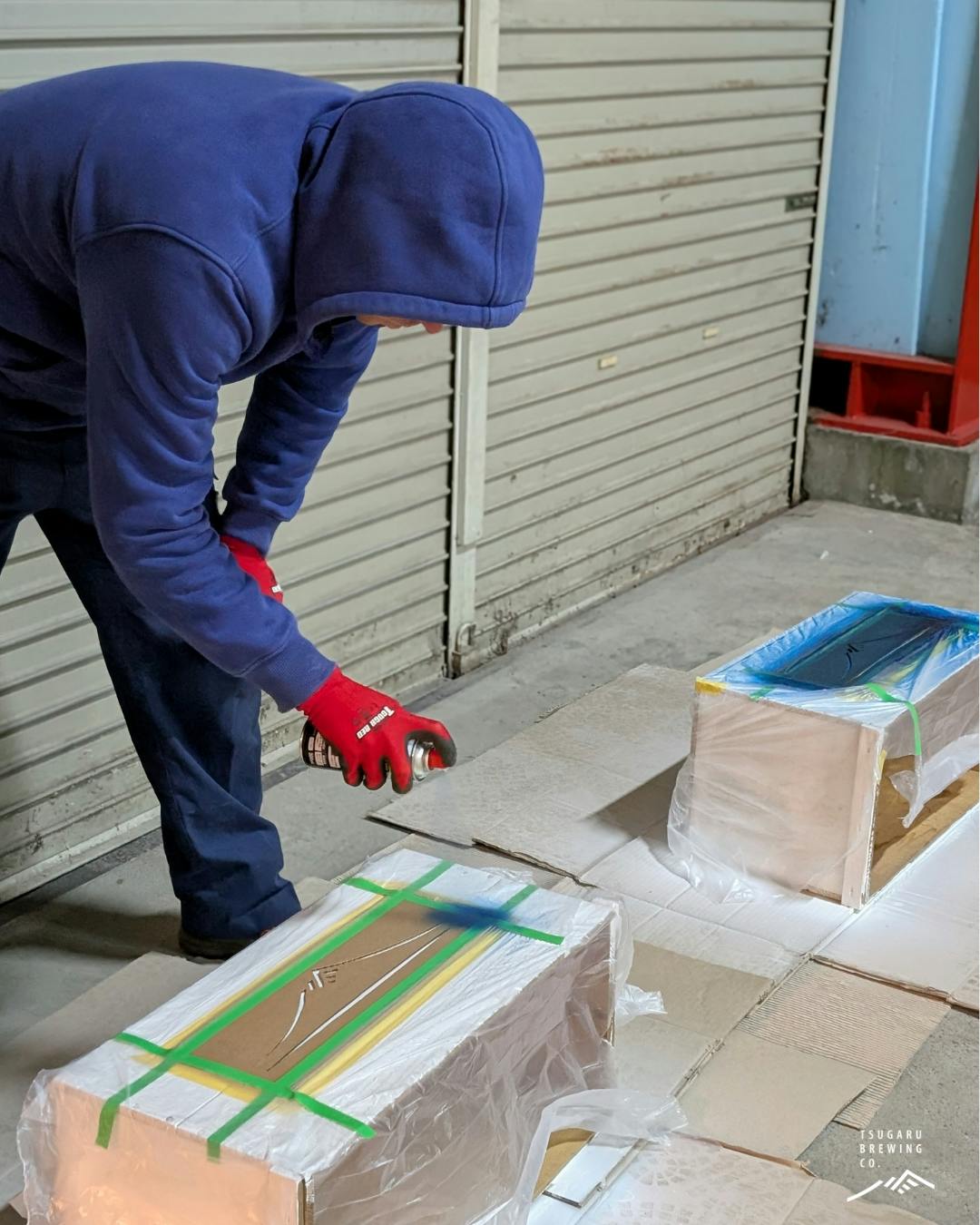 そしてクリスは りんご木箱にペンキとスプレーを使って